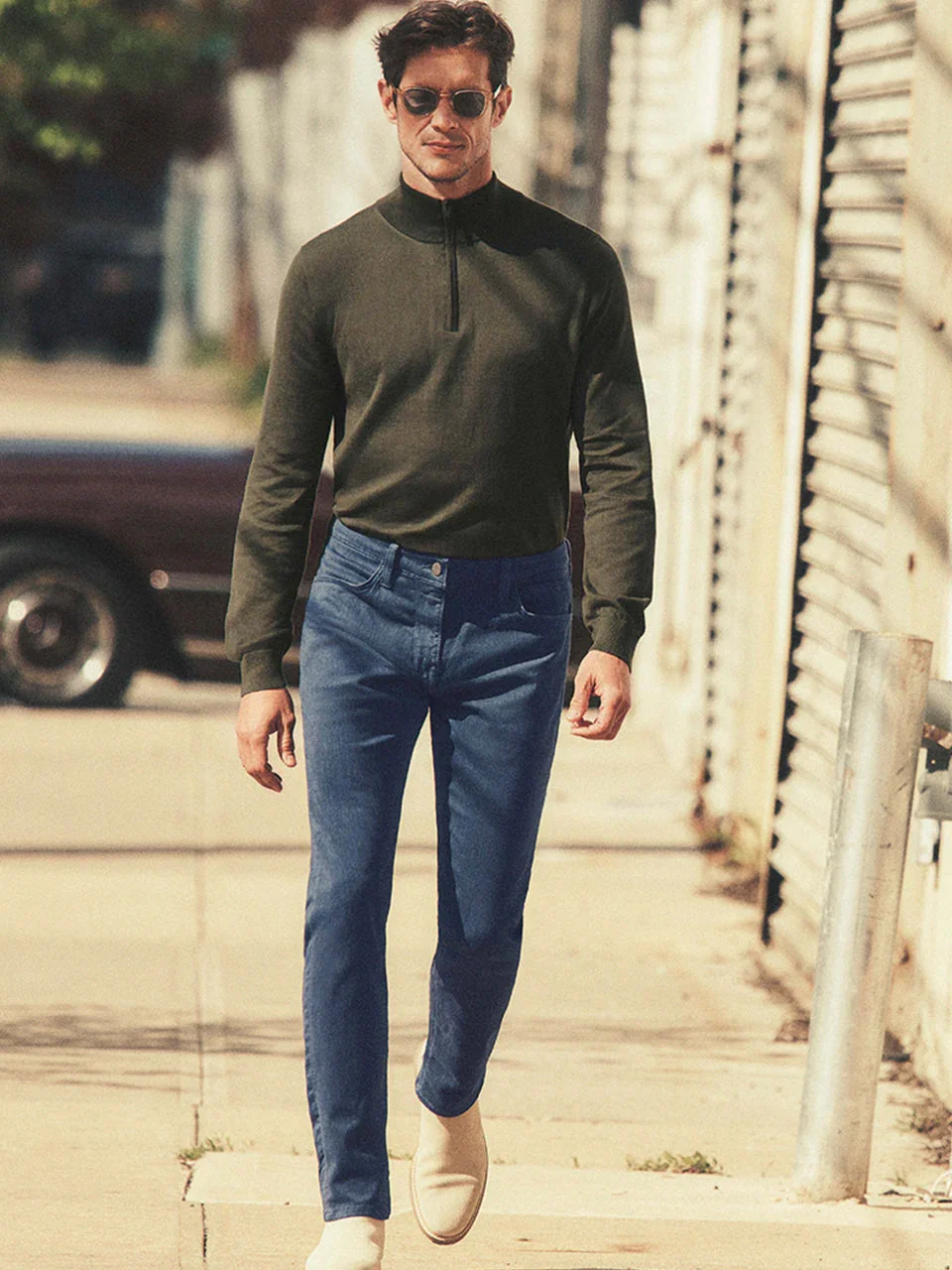 Le mannequin mesure 6’1″ et porte une taille 32W/34L.