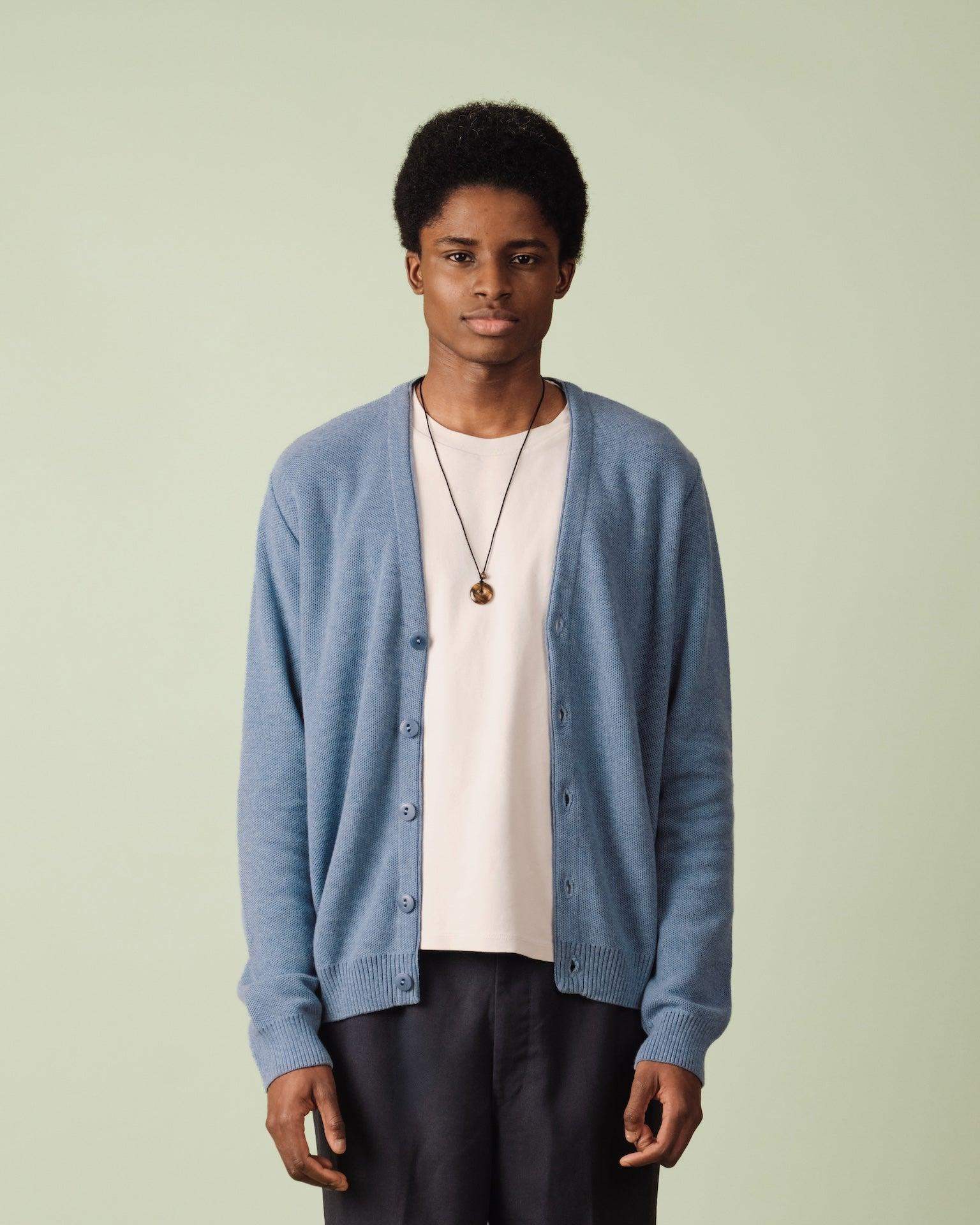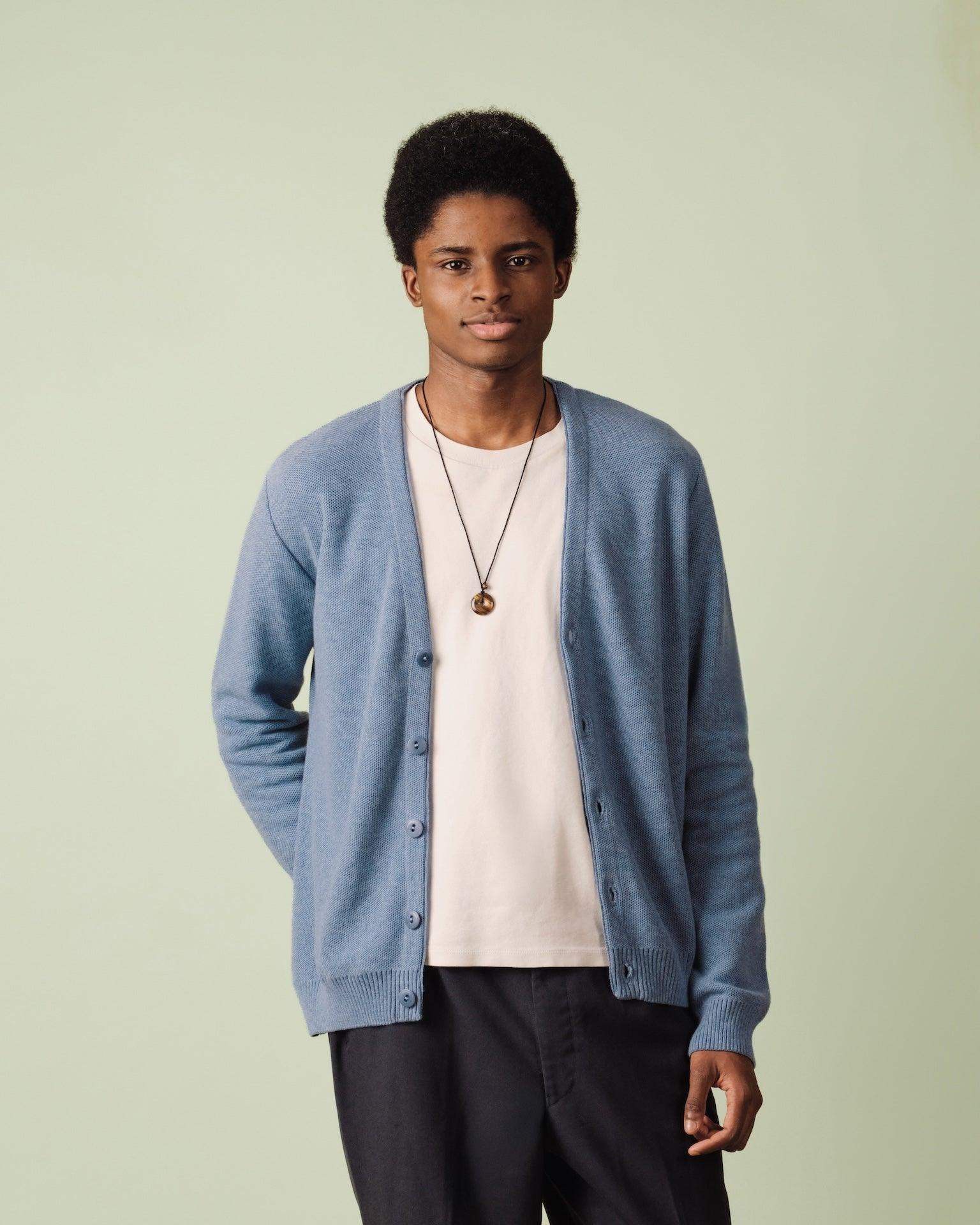 Sa maille piquée bien serrée lui confère une structure élégante tout en offrant une sensation de douceur et de confort. Le design épuré, sans poches, et les cinq boutons en corozo apportent une touche de sophistication naturelle.