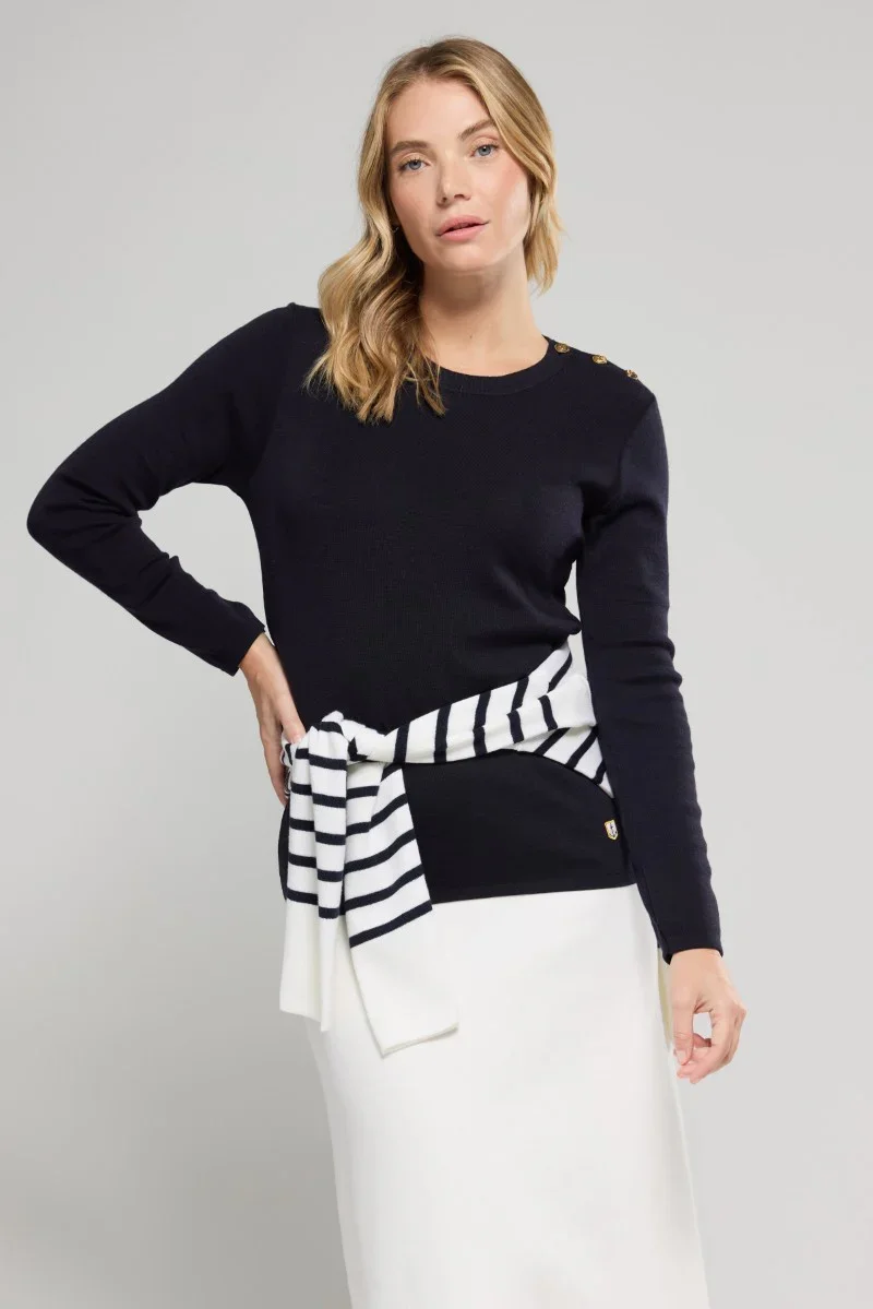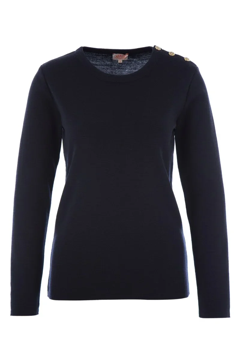 Pull marin uni pour femme, encolure ronde et patte de boutonnage sur l’épaule gauche avec boutons dorés gravés, en côte 1×1.