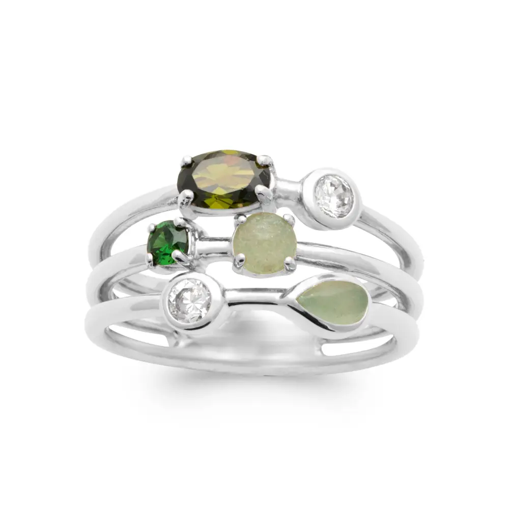 Bague 3 anneaux argent rhodié émeraude et diamants synthétiques
