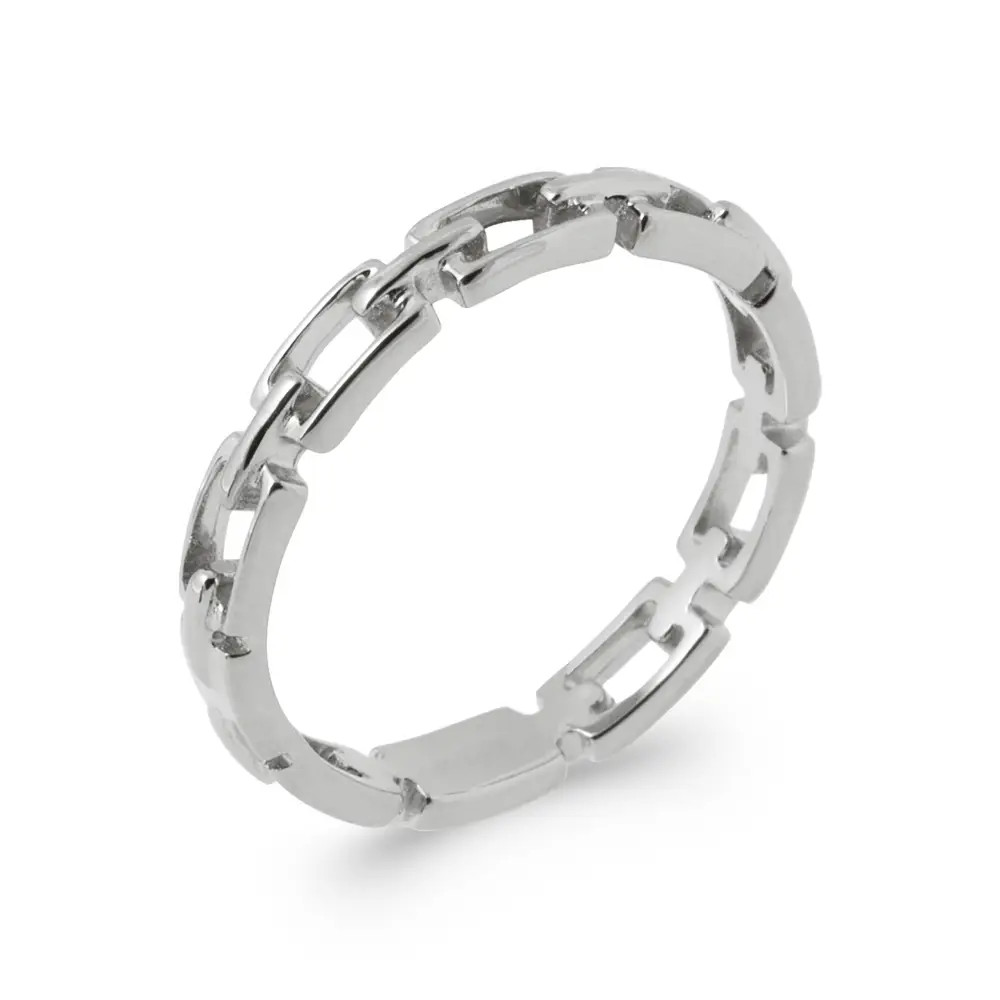 La bague chaîne design Emma argent rhodié est une pièce d’exception qui se distingue par son élégance subtile et son design contemporain. Chaque détail de cette bague a été pensé avec soin pour créer un bijou qui est à la fois moderne et intemporel. Les petits maillons rectangulaires, placés horizontalement, sont délicatement reliés par des anneaux positionnés sur la tranche, créant un jeu de formes et de lumières fascinant.