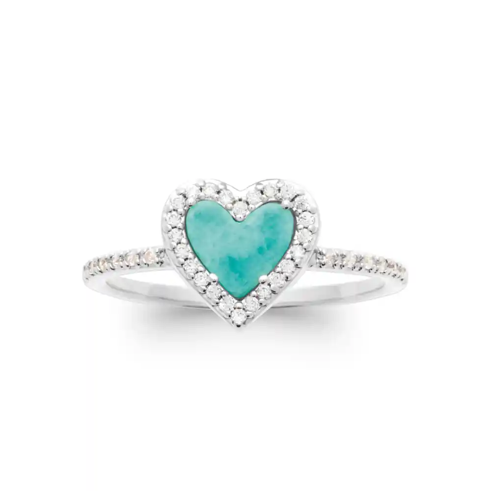 La bague en argent rhodié avec amazonite ‘Amélie’ est une véritable ode à la couleur et à la clarté. Au centre, un coeur d’amazonite d’un bleu vert rappelant les eaux tropicales est magnifiquement mis en exergue par un entourage de petites pierres cristallines. L’anneau fin et élégant qui soutient ce coeur coloré est lui-même parsemé de ces étincelles, conférant à l’ensemble une harmonie scintillante et un caractère plein de fraîcheur.