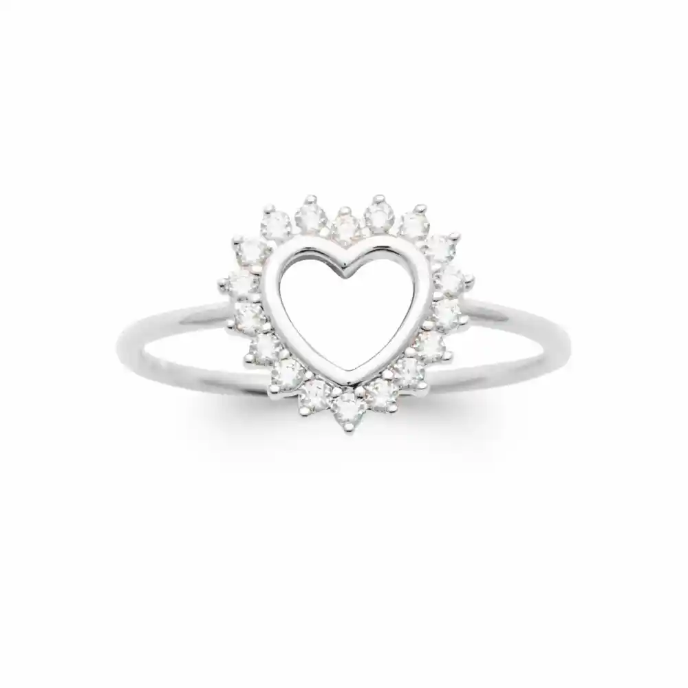 La bague que vous contemplez est ornée d’un coeur en argent rhodié qui semble flotter au milieu d’un soleil scintillant, formé par un cercle de pierres lumineuses. La forme ouverte du coeur en son centre crée un jeu de lumière et d’ombre captivant, tandis que les pierres autour évoquent les rayons d’un soleil étincelant.