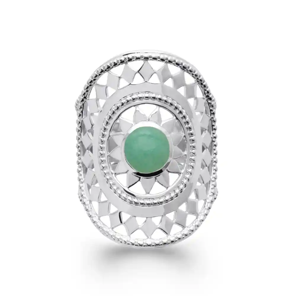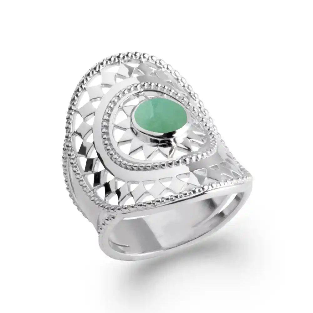 Cette bague englobante présente un style affirmé qui capture le regard. Son corps en argent rhodié se déploie généreusement autour du doigt, offrant une surface sculptée de motifs géométriques qui jouent avec la lumière. L’argent rhodié, connu pour sa brillance durable et sa résistance au ternissement, crée un écrin parfait pour la pierre centrale. Au coeur de cette pièce maîtresse, une pierre d’aventurine de forme ovale apporte une touche de couleur vibrante. L’aventurine, reconnue pour sa teinte verte naturelle et ses subtiles inclusions scintillantes, confère à la bague une dimension organique et apaisante. Cet assemblage entre la précision des motifs argentés et la douceur de la pierre verte crée un contraste saisissant.