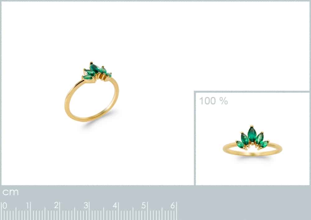 Un éclat vert intense attire le regard vers cette bague qui joue avec la lumière comme avec les émotions, suggérant mystère et élégance à chaque pas. Son allure raffinée invite à imaginer une présence forte et délicate à la fois, portée avec assurance au quotidien. Le design met en scène cinq émeraudes synthétiques alignées sur un anneau délicat, créant une harmonie visuelle équilibrée qui évoque la nature et la profondeur d’un jardin secret. Ces pierres se répondent avec grâce sur le corps doré de la bague. Façonnée en plaqué or 18 carats avec une base en laiton hypoallergénique sans nickel…