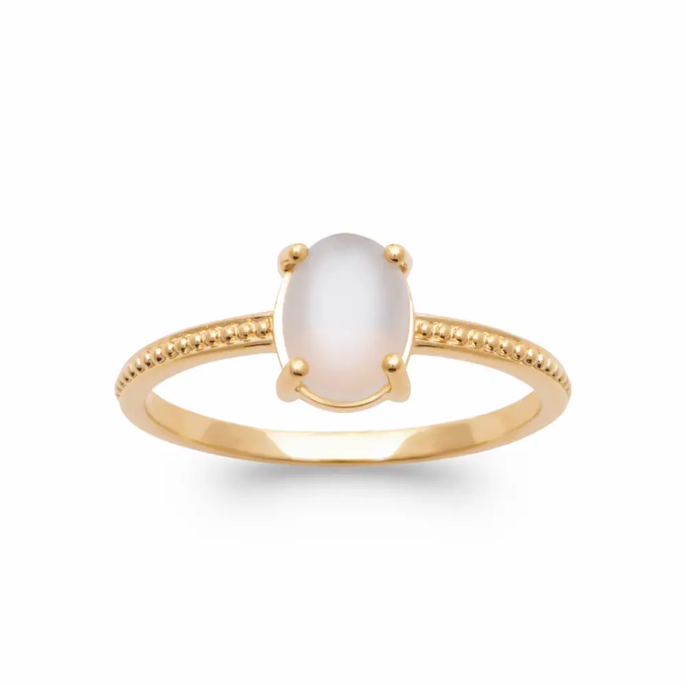 Cette bague en plaqué or, avec son solitaire en pierre de lune, est un modèle d’élégance et de finesse. L’anneau délicat est ponctué de petites sphères rappelant de micro-perles, qui ajoutent une texture subtile et raffinée au design global. La pierre, aux teintes lactescentes, est encadrée par quatre griffes minimalistes qui la mettent en valeur sans surcharger l’ensemble.