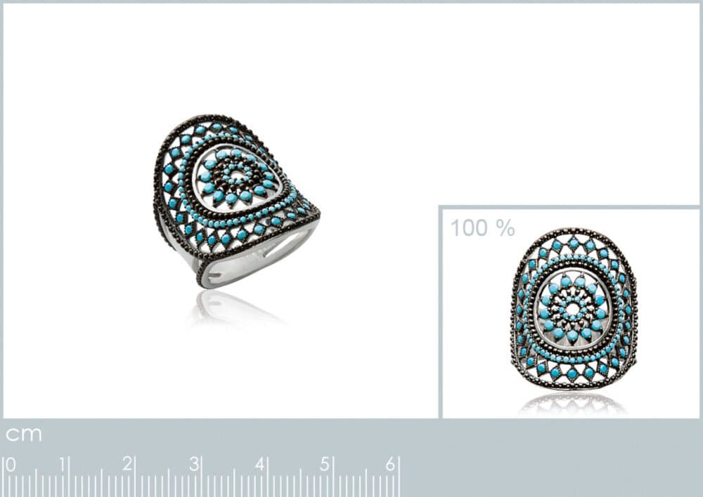 Un motif rosace délicatement allongé enlace le doigt avec une élégance inspirée, comme une mosaïque de lumière posée avec grâce. Cette bague évoque une féminité raffinée, prête à sublimer chaque moment par une touche d’harmonie et de couleur. Son design ethnique met en valeur une multitude de petites pierres turquoise aux nuances apaisantes, disposées avec précision en un motif circulaire enchâssé dans l’argent. Les teintes bleutées créent un contraste délicat avec la matière, donnant à l’ensemble une présence vibrante et captivante. Conçue en argent 925 rhodié, cette bague pour femme bénéficie d’une finition soignée qui protège le métal contre l’oxydation…