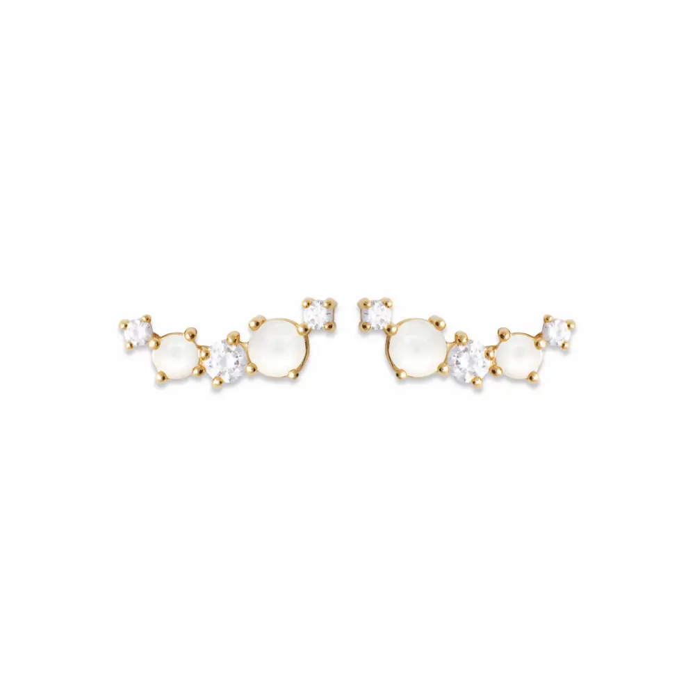 Ces boucles d’oreilles contour de lobe présentent une alternance raffinée de pierres de lune et de diamants synthétiques, disposées avec un sens artistique sur une monture en plaqué or. Les pierres de lune offrent leur douceur opalescente tandis que les diamants synthétiques ajoutent des points de lumière étincelante, créant une constellation éblouissante le long du lobe de l’oreille. La monture en plaqué or apporte une continuité chaleureuse à ce parcours de pierres, liant chaque gemme dans une composition gracieuse qui épouse la courbe naturelle de l’oreille. Cette pièce est une déclaration de finesse, un bijou qui allie la tendresse de la lune et le scintillement des étoiles.