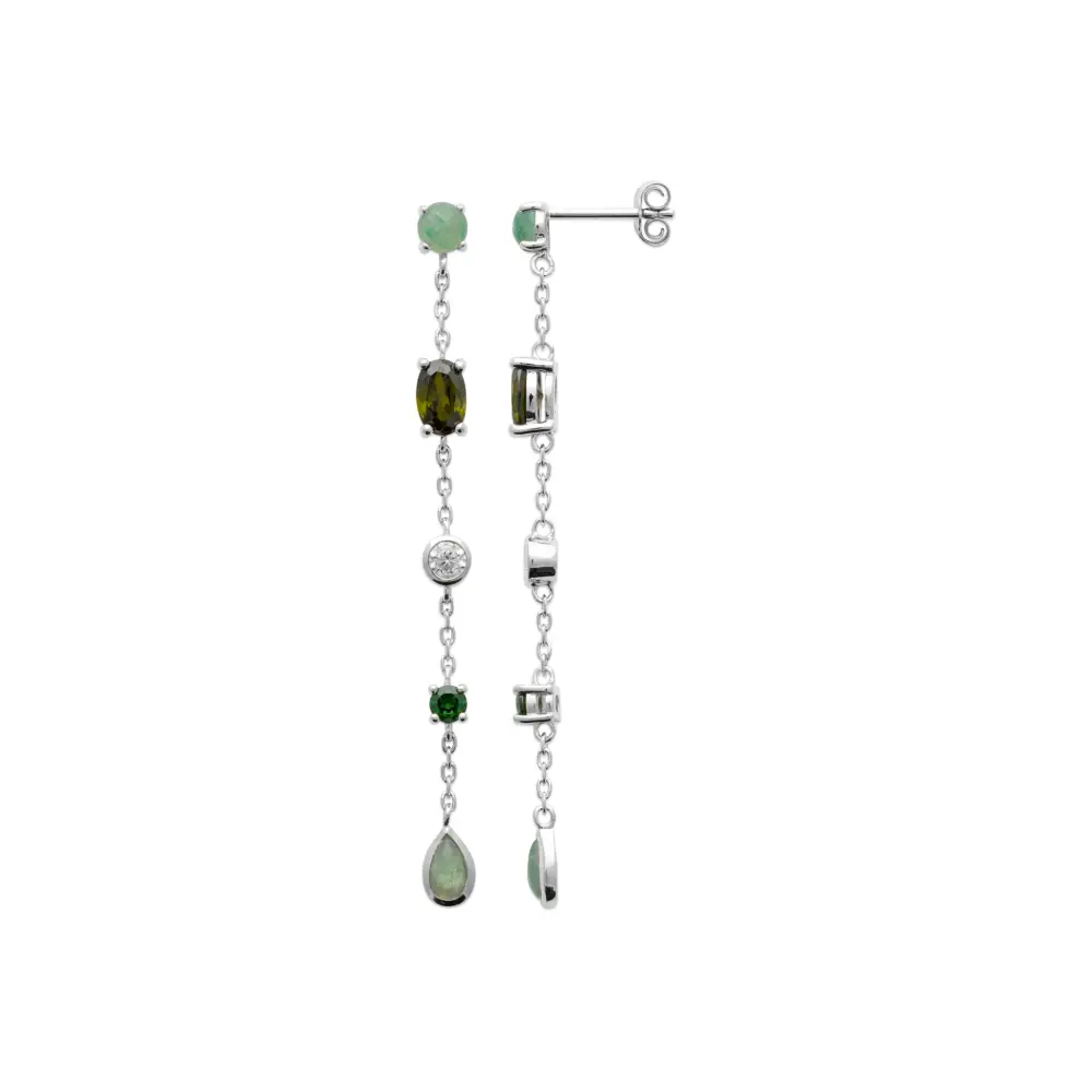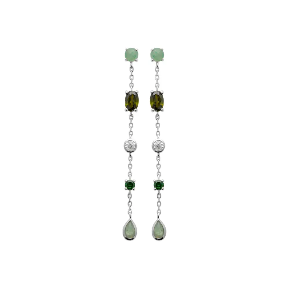 Enveloppé dans l’éclat de l’argent rhodié, ce bijou évoque la magie des moments précieux. Les boucles d’oreilles pendantes captent le regard grâce à la danse des aventurines aux teintes douces, rappelant la sérénité d’un paysage forestier. Plus bas, l’émeraude, d’un vert profond, évoque le mystère et le luxe, tandis que les diamants synthétiques insufflent une brillance inégalée. Chaque gemme a été choisie pour sa beauté, formant une symphonie de couleurs et d’éclats.