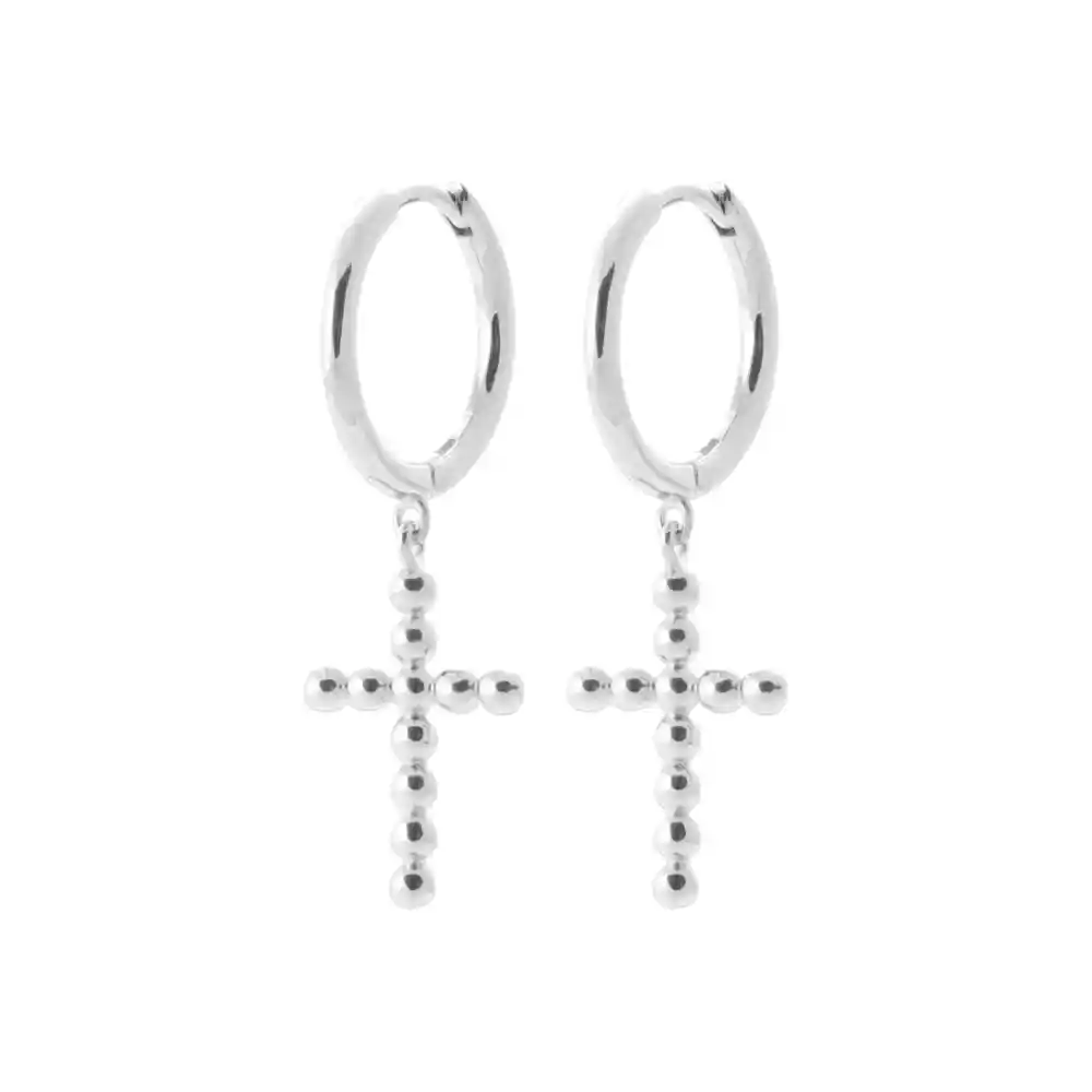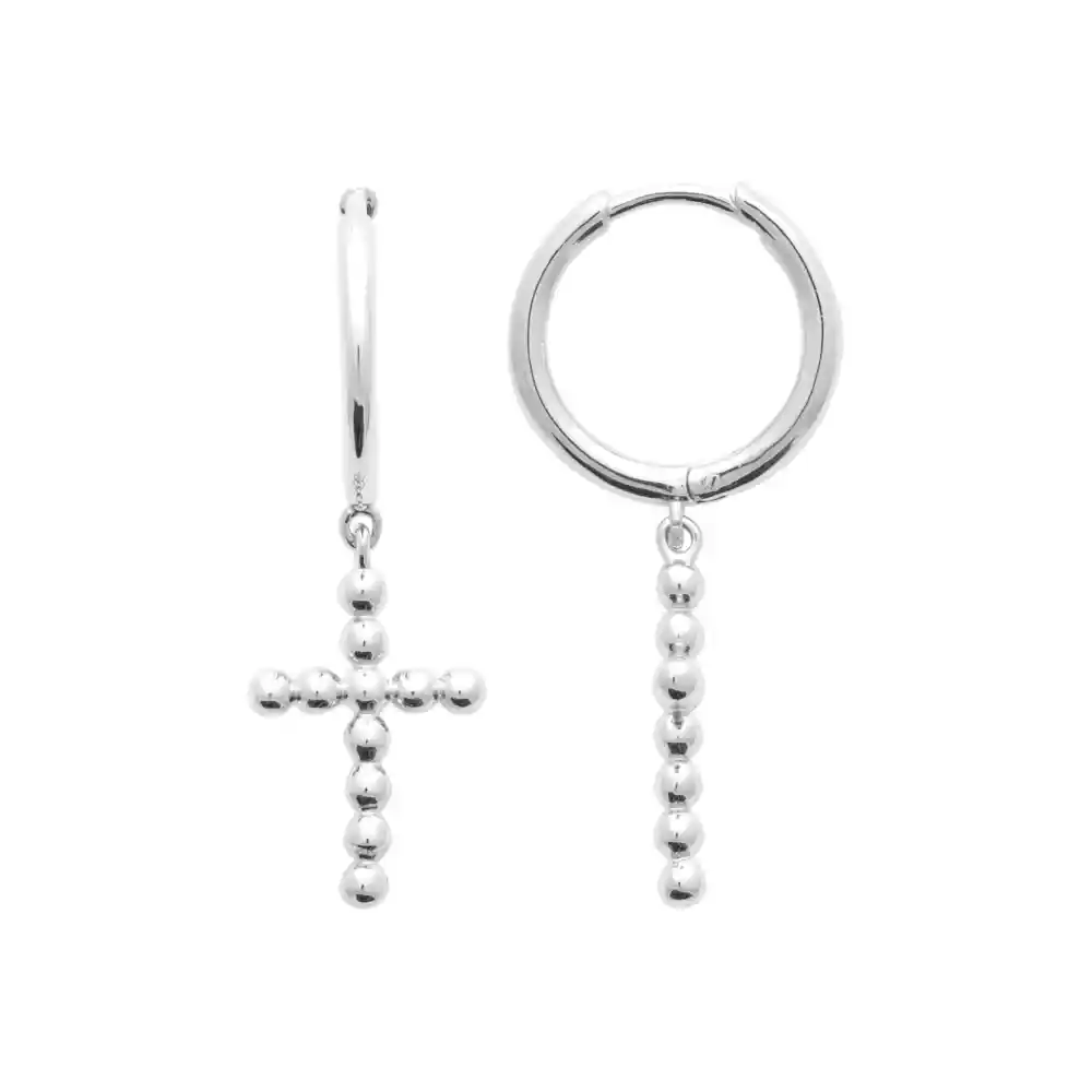 Ces boucles d’oreilles pendantes marient spiritualité et tendance avec une grâce insaisissable. Les croix, délicatement suspendues à des anneaux lisses en argent rhodié, sont composées de petites perles méticuleusement alignées. Leur éclat argenté est la promesse d’un effet lumineux et raffiné, offrant une aura de pureté et de modernité à celles qui les portent.