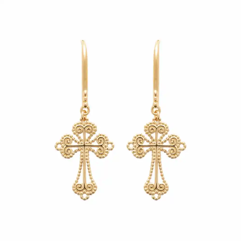 Ces boucles d’oreilles pendantes Sophia prĆ©sentent un design dĆ©licat et dĆ©taillĆ© qui capture le regard. RĆ©alisĆ©es avec soin, elles arborent une croix aux contours arrondis, agrĆ©mentĆ©e de volutes et de petits points en relief, Ć©voquant le travail minutieux de la bijouterie traditionnelle. La finition en plaquĆ© or leur confĆØre une brillance chaude et solaire, reflĆ©tant la lumiĆØre avec grĆ¢ce Ć chaque mouvement.