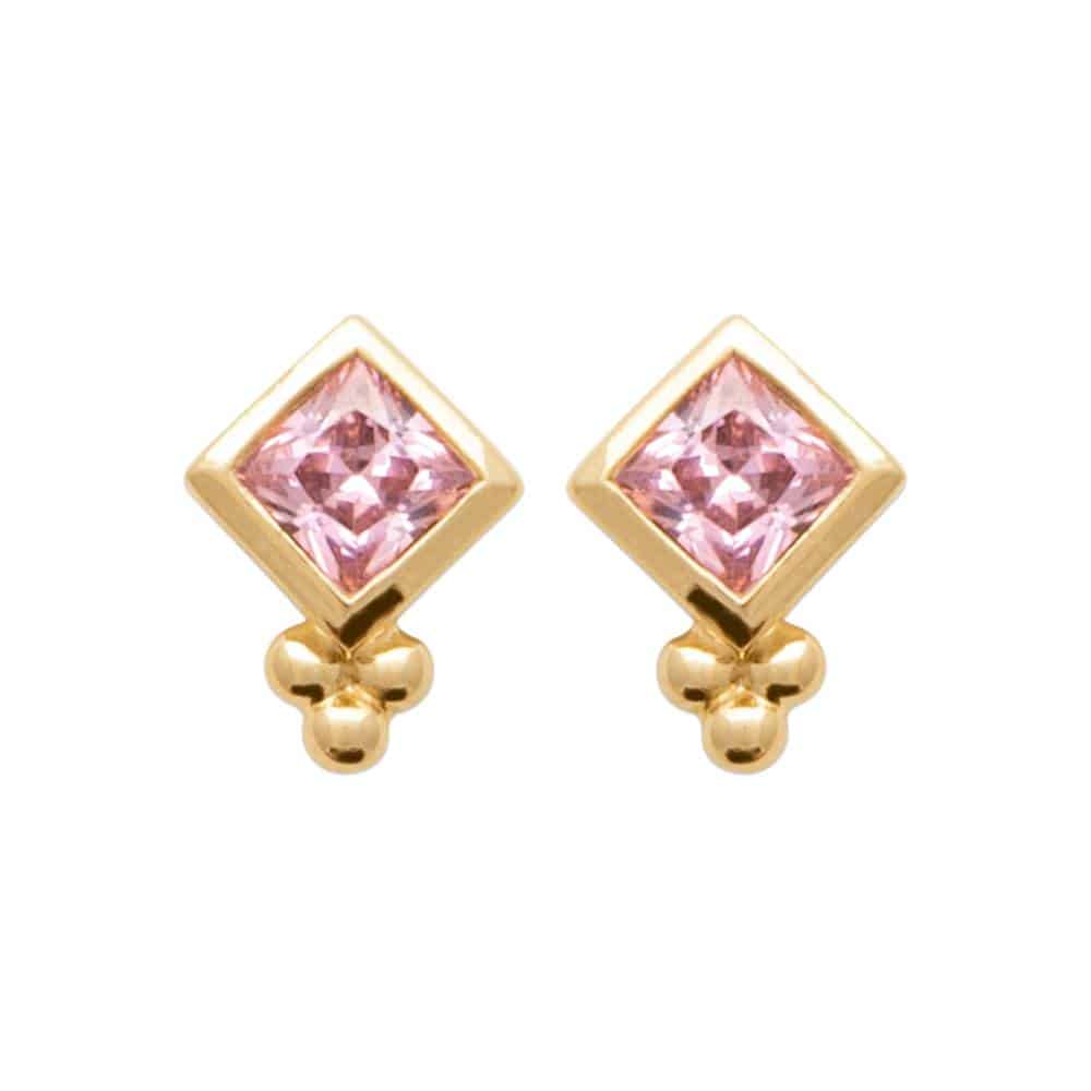 Ces boucles d’oreilles se distinguent par leur quartz rose synthétique taillé en forme de losange, enchâssé dans une monture en plaqué or. La couleur rosée du quartz apporte une douceur visuelle, tandis que la coupe précise de la pierre synthétique offre une clarté et un éclat remarquables.