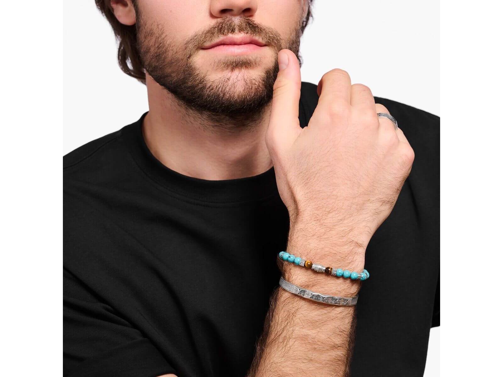 Ce bracelet pour homme allie élégance et symbolisme avec ses perles en imitation turquoise et œil de tigre poli, rehaussées de beads en argent sterling 925 noirci. Chaque bead arbore des gravures artistiques représentant un sablier stylisé et le chemin sinueux de la vie, rappelant l’importance du temps qui passe. Disponible en trois tailles (15,5, 17 et 19 cm), ce bijou unique apporte une touche d’énergie positive et un style saisissant à votre poigne