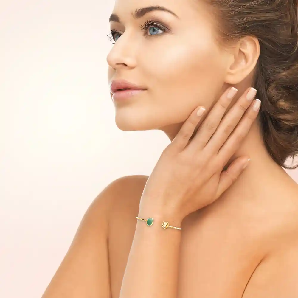 Une brise tropicale semble s’ĆŖtre dĆ©posĆ©e sur ce bijou Ć l’allure rĆ©solument exotique. Ce bracelet ouvert met en scĆØne un face-Ć -face poĆ©tique entre la douceur d’une pierre naturelle et la finesse d’un motif vĆ©gĆ©tal, Ć©voquant la sĆ©rĆ©nitĆ© d’un jardin lointain. Le design se distingue par sa structure rigide et Ć©purĆ©e, accueillant Ć ses extrĆ©mitĆ©s une aventurine verte et une feuille de palmier finement ciselĆ©e. Ce contraste entre l’Ć©clat minĆ©ral et le dĆ©tail dorĆ© crĆ©e un Ć©quilibre visuel parfait, soulignant le poignet avec une Ć©lĆ©gance moderne. ConƧu en plaquĆ© or 18 carats avec une Ć©paisseur de 3 microns, ce bijou afficheā¦