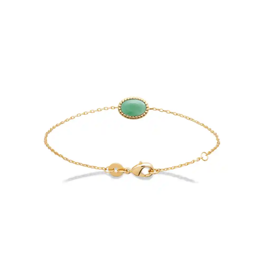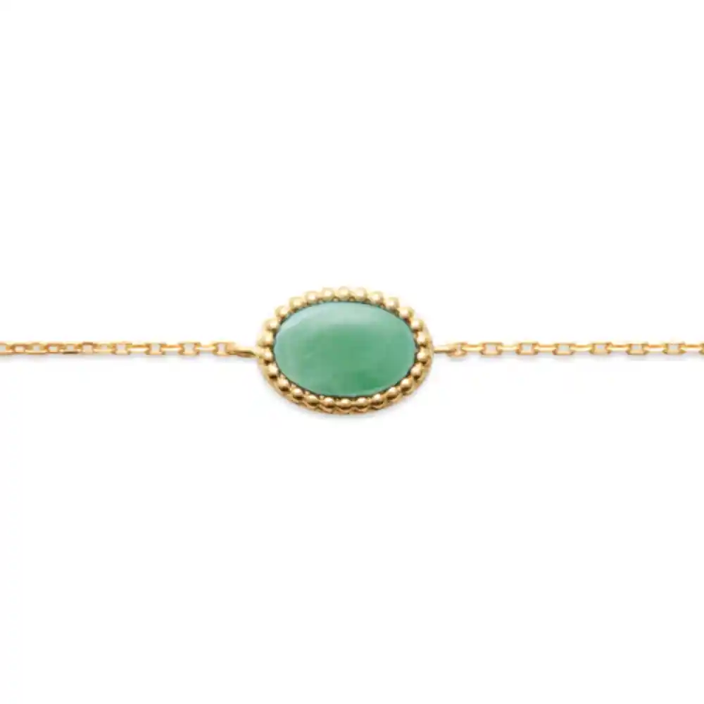 Ce bracelet dĆ©licat est un exemple exquis de l’art de la joaillerie qui unit la brillance du plaquĆ© or et la beautĆ© organique de l’aventurine. La pierre, taillĆ©e en cabochon ovale, dĆ©ploie une couleur verte profonde et uniforme, Ć©voquant la sĆ©rĆ©nitĆ© des forĆŖts anciennes. Elle est encadrĆ©e par une bordure dĆ©licatement travaillĆ©e, composĆ©e de petites billes dorĆ©es qui ajoutent une texture riche et une dimension supplĆ©mentaire au design.
