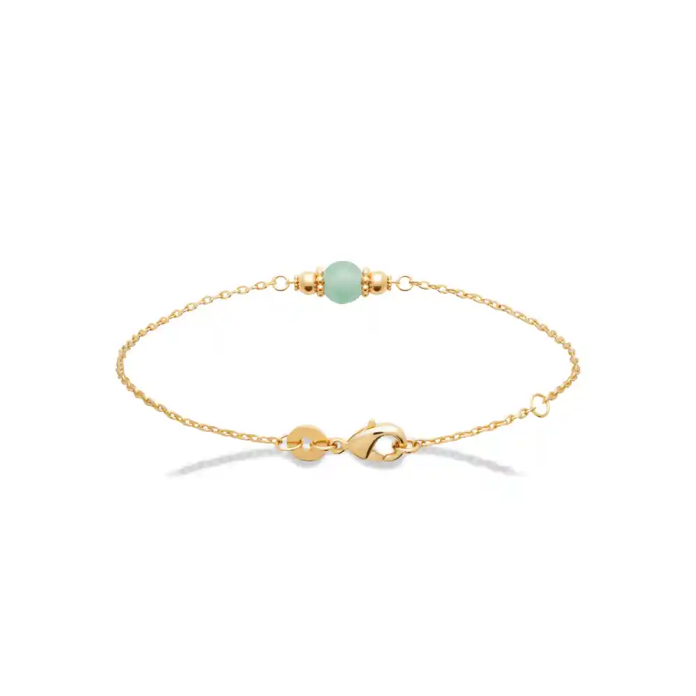 Ce dĆ©licat bracelet se prĆ©sente comme une symphonie subtile de couleurs et de matĆ©riaux, où un unique cabochon d’aventurine se dĆ©tache sur une chaĆ®ne en plaquĆ© or. La pierre, d’un vert doux et translucide, est magnifiquement mise en valeur par deux petites sphĆØres dorĆ©es qui lui confĆØrent un Ć©quilibre parfait entre nature et luxe discret.