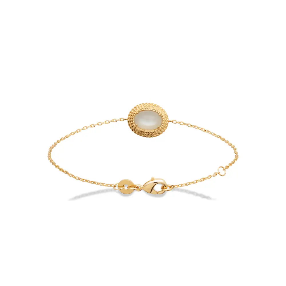 Pour une parure complète, envisagez ce bracelet avec des joncs en plaqué or travaillés, apportant ainsi de la texture et de la variété à votre poignet. Un collier ras-du-cou orné d’une pierre de lune similaire pourrait être le complice idéal pour un look harmonieux. Ne négligez pas l’ajout de clous d’oreilles minimalistes en plaqué or qui reflèteront la simplicité de la chaîne tout en laissant la pierre être la star de la soirée.