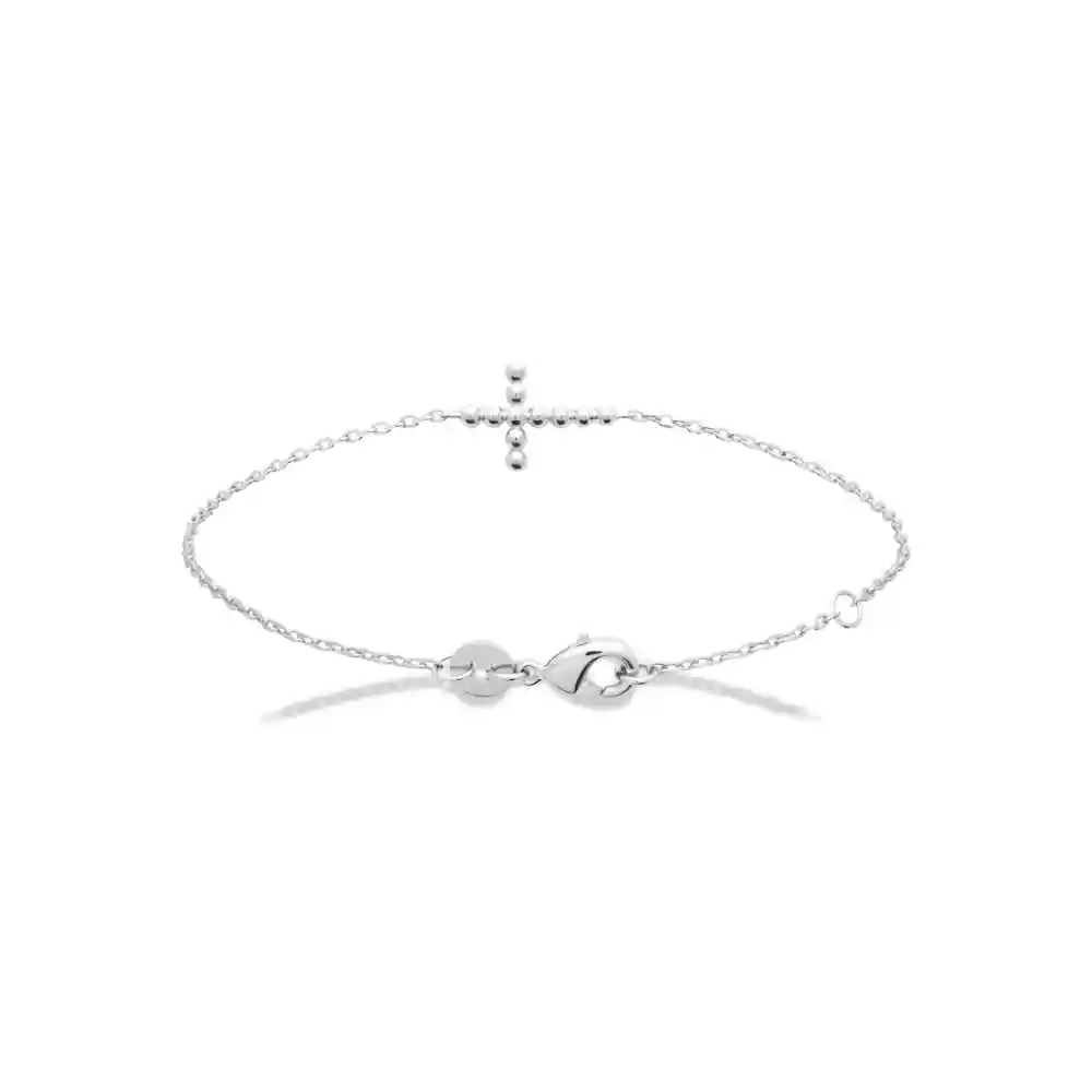 Ce bracelet à chaîne fine en argent rhodié se distingue par son élément central : une croix constituée de perles métalliques lustrées. Chaque perle est disposée avec précision, créant un symbole à la fois classique et réinventé. Les maillons délicats de la chaîne contrastent avec la texture des perles, offrant un jeu de matières et de brillance qui attire l’Å“il.