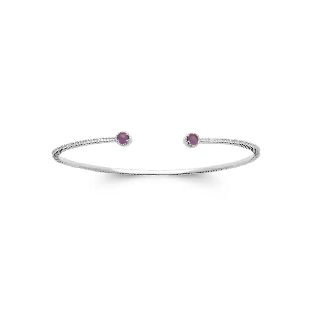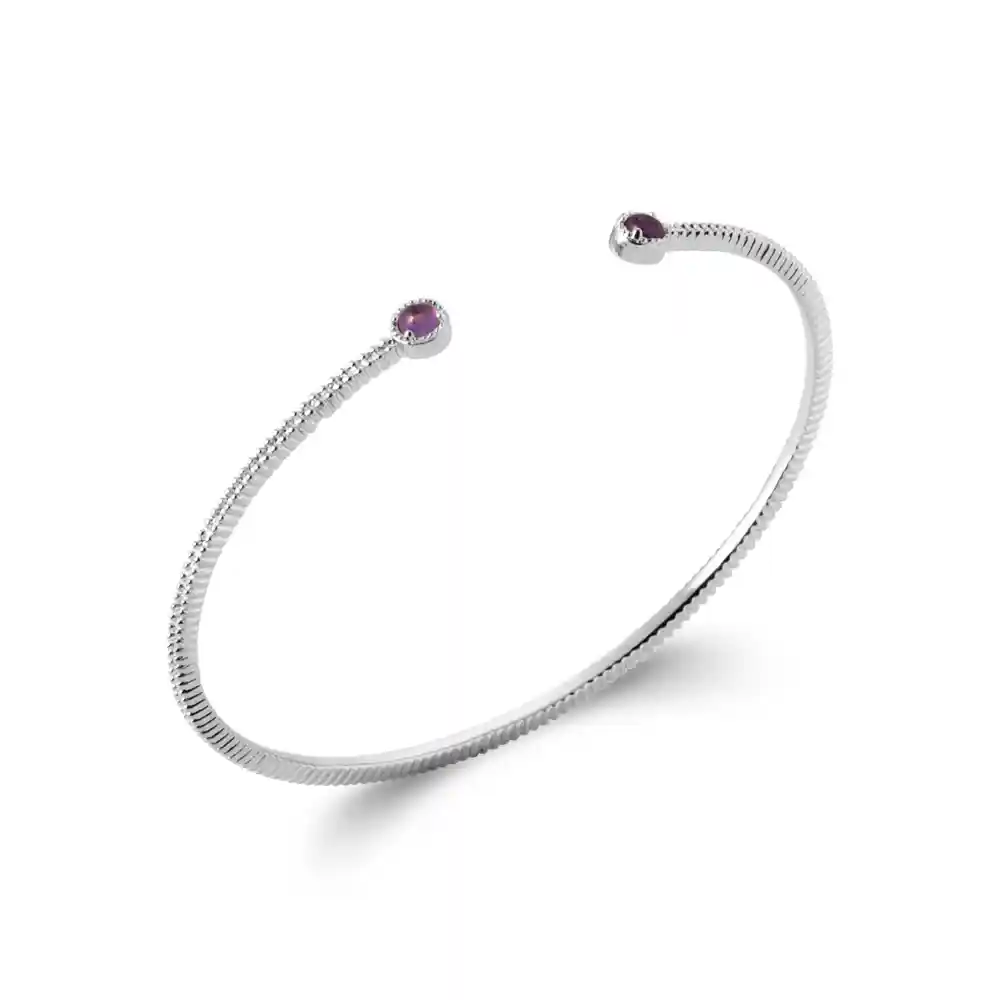 Ce bracelet jonc est d’une élégance discrète et sophistiquée, paré d’argent rhodié qui lui confère un éclat durable, évitant le ternissement. Il est embelli par deux pierres d’améthyste de couleur violet profond, disposées à chaque extrémité du jonc. La forme ouverte du bracelet permet une mise en place aisée et un ajustement confortable à diverses tailles de poignet. La surface du métal est finement travaillée avec une texture qui capte la lumière, ajoutant un aspect délicat à l’ensemble.