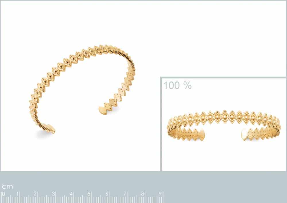 La matiĆØre en plaquĆ© or, d’une Ć©paisseur de 3 microns, confĆØre Ć ce bracelet une durabilitĆ© et une rĆ©sistance Ć l’Ć©preuve du temps. Lāor 18 carats utilisĆ© pour le placage, renforcĆ© par une couche de finition en or 24 carats, protĆØge le bijou de lāoxydation naturelle, prĆ©servant ainsi son Ć©clat initial.