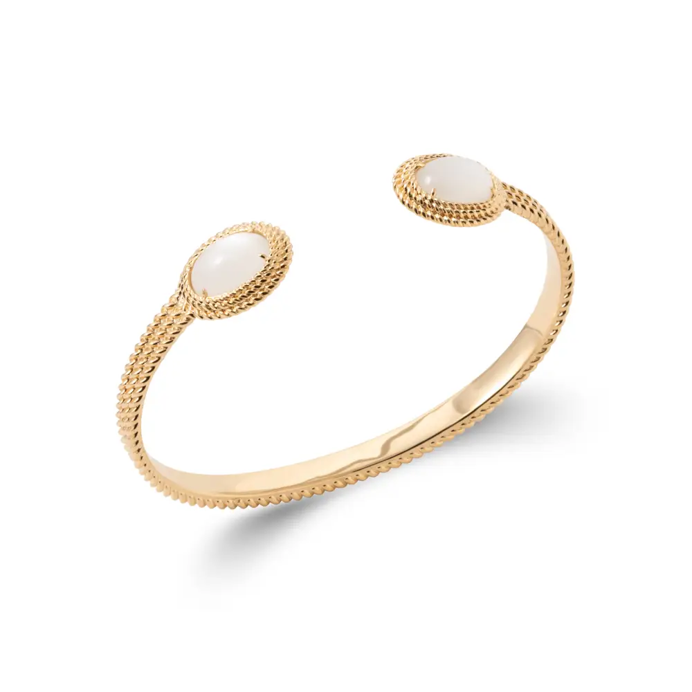 Ce bracelet jonc en plaquĆ© or 18 carats allie la dĆ©licatesse de l’artisanat Ć l’Ć©lĆ©gance naturelle de la pierre de lune. Sa structure dĆ©licate, avec une Ć©paisseur d’or de 3 microns, offre une base solide et Ć©clatante pour les deux pierres de lune enchĆ¢ssĆ©es dans un motif tressĆ©. Ces joyaux laiteux, capturĆ©s dans une Ć©treinte dorĆ©e, semblent irradier une lumiĆØre intĆ©rieure, Ć©voquant la douceur du clair de lune. Le design du bracelet est rehaussĆ© par une texture tressĆ©e qui entoure les pierres, donnant Ć ce bijou un aspect Ć la fois sophistiquĆ© et organique. C’est un hommage Ć la beautĆ© de la nature, magnifiĆ©e par le travail dĆ©licat du mĆ©tal.