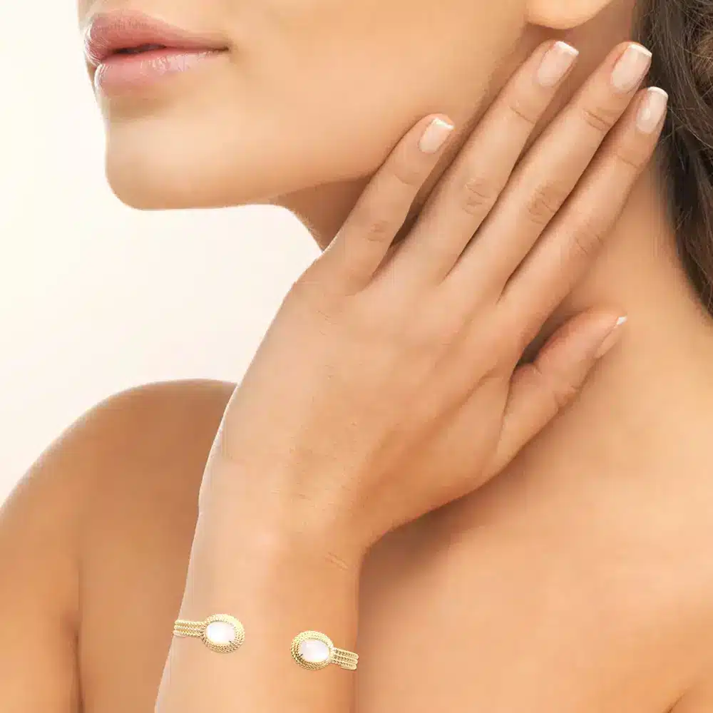 Ce bracelet pierre de lune en plaquĆ© or s’adapte Ć une multitude de looks. Il peut apporter une touche d’Ć©lĆ©gance Ć une robe d’Ć©tĆ© lĆ©gĆØre ou complĆ©ter un ensemble plus structurĆ© comme un tailleur pantalon beige. Pour une occasion spĆ©ciale, il se marie parfaitement avec une robe longue et fluide, où les pierres de lune captureront la lumiĆØre de faƧon spectaculaire. Dans un cadre plus quotidien, il peut sublimer un haut Ć col en V et un jean slim, prouvant qu’un bijou raffinĆ© a sa place dans chaque moment de la vie. Ce bracelet jonc avec ses pierres de lune dans une tresse dorĆ©e est une piĆØce qui parle d’histoire, d’art et de la magie du quotidien.