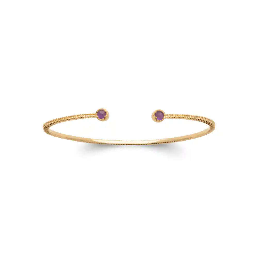 Une aura mystérieuse se dessine autour du poignet avec ce bracelet jonc ponctué de deux améthystes. Son éclat doré dialogue avec la profondeur violette des pierres, créant une présence à la fois douce et affirmée, empreinte de sérénité. Le design s’appuie sur un jonc ouvert aux lignes épurées, rythmé par deux pierres disposées face à face. Cette symétrie apporte un équilibre visuel élégant, où la couleur intense de l’améthyste capte le regard sans excès. Réalisé en plaqué or, ce bracelet met en valeur deux pierres naturelles d’améthyste à la teinte violette profonde. Le travail du métal souligne la pureté des…