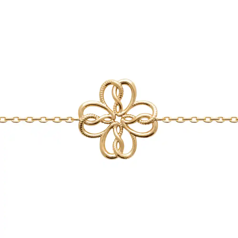 Ce bracelet plaqué or se distingue par son motif central, un trèfle à quatre feuilles élégamment tressé, qui symbolise à la fois la chance et la finesse du travail artisanal. Chaque feuille est soigneusement entrelacée avec les autres, créant une harmonie visuelle exceptionnelle. La finition brillante du plaqué or ajoute une touche de lumière qui capte le regard et sublime votre gestuelle.