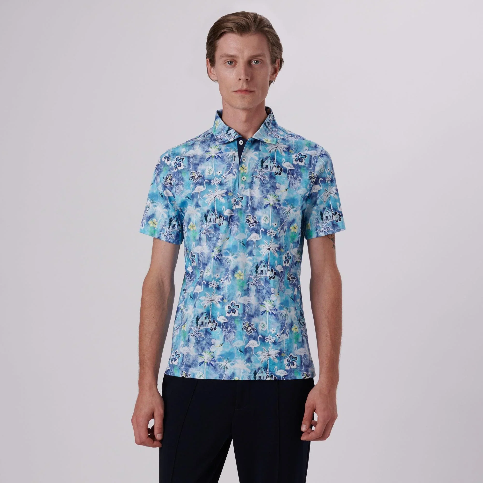 Polo HENDRIX flamingo floral à manches courtes en 100% coton mercerisé imprimé numérique avec des détails contrastés unis, une patte de boutonnage à trois boutons, des boutons en nacre véritable et un col dans le même tissu.