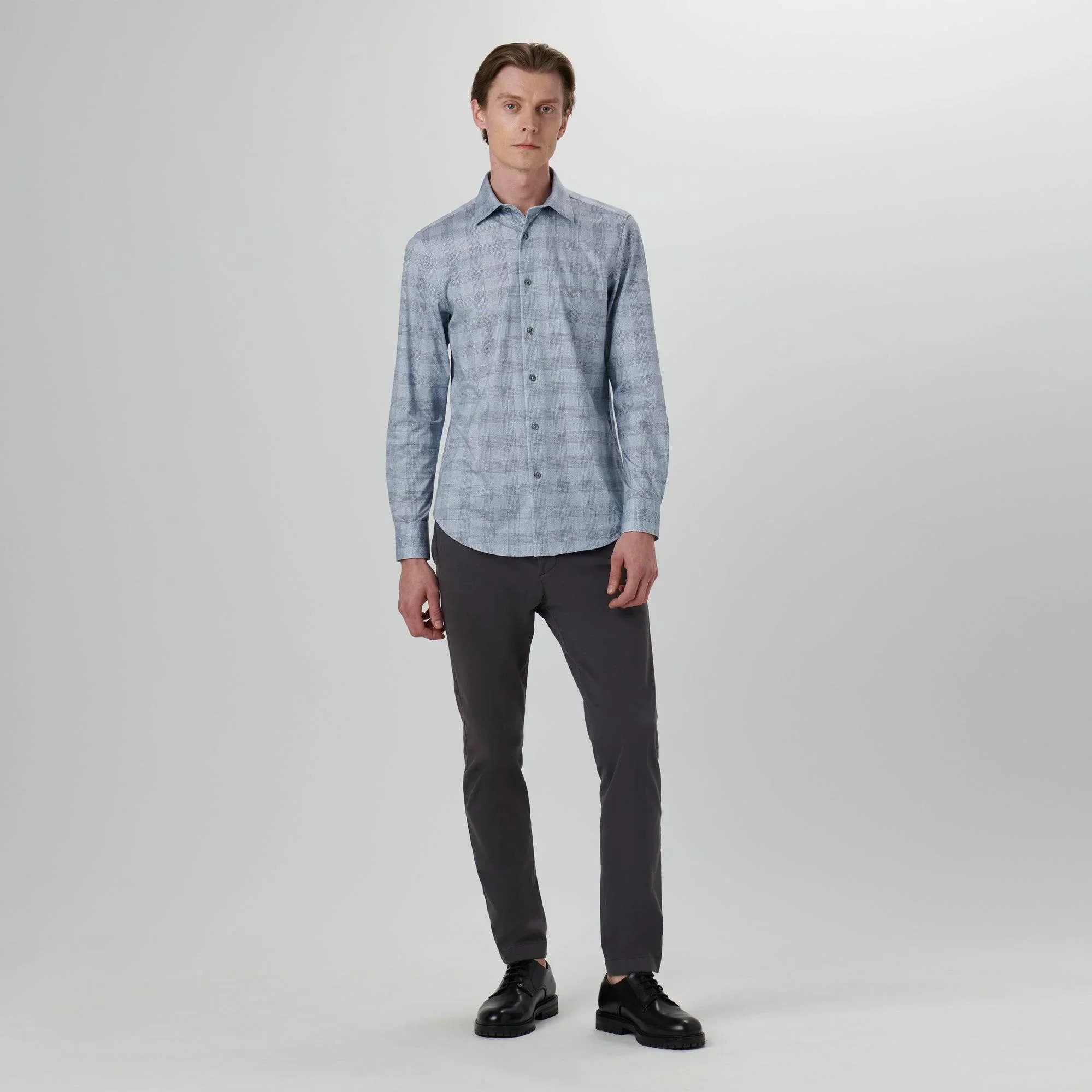 Chemise à manches longues à imprimé carreaux JAMES en OoohCotton avec col en pointe, patte de boutonnage française, poignets crantés réglables, boutons en nacre véritable et ourlet incurvé. OoohCotton est un mélange de coton double mercerisé, infroissable et antimicrobien avec des caractéristiques d’étirement dans les 8 sens, de respirabilité, d’entretien facile, de séchage rapide et de confort thermique.