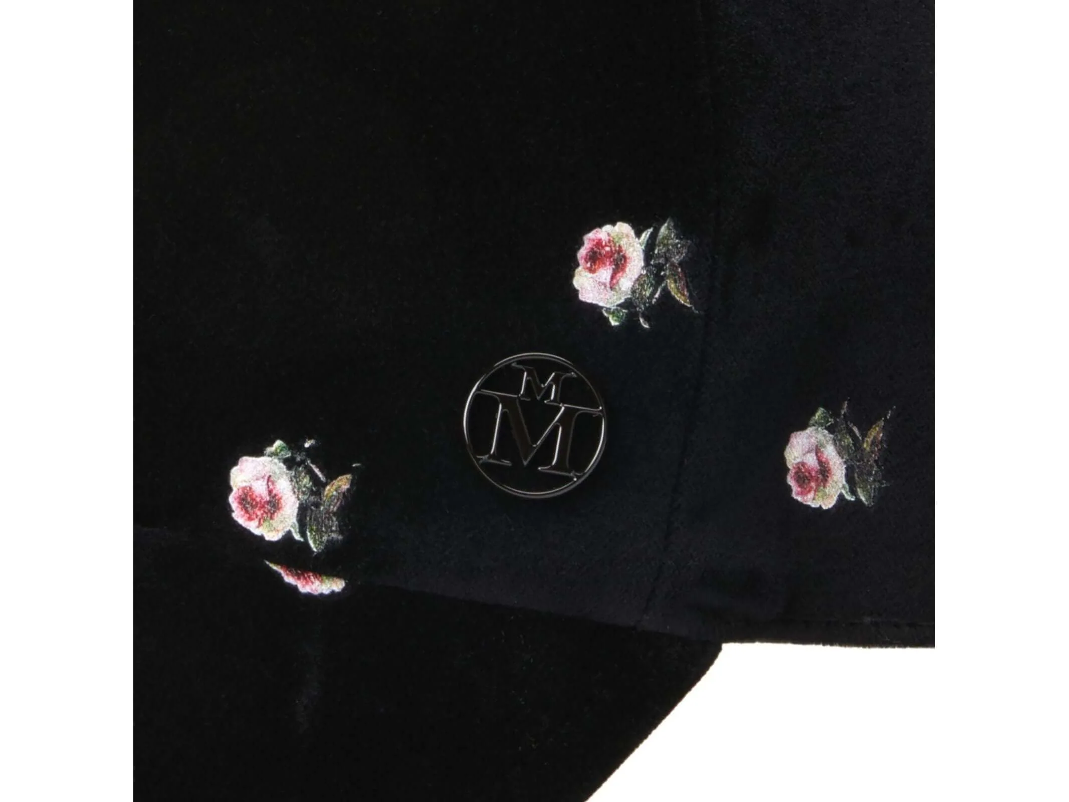 Cette casquette en velours noir allie élégance et originalité grâce à ses motifs imprimés roses délicats. Signée Maison Michel, elle affiche un logo noir subtil qui souligne son prestige. Un accessoire raffiné pour apporter une touche sophistiquée à toutes vos tenues.