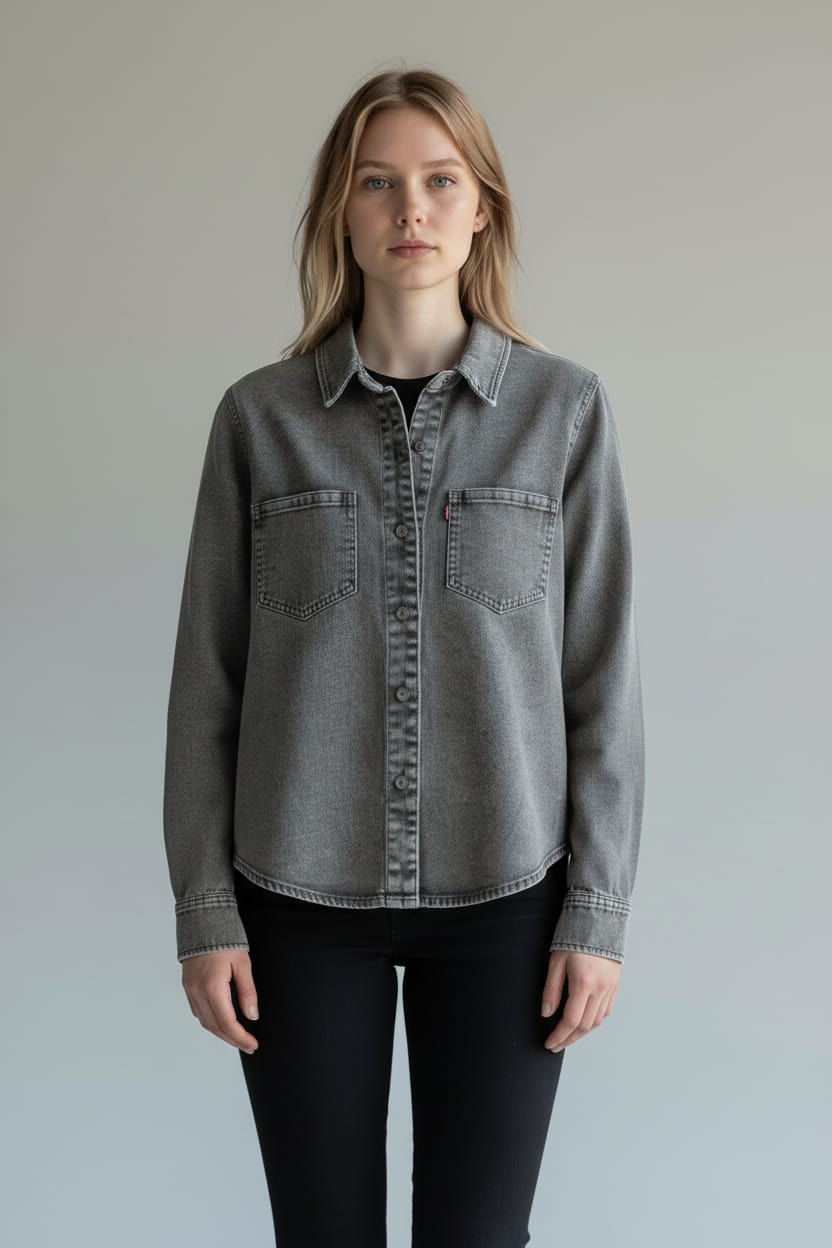 Sa teinte grise, sobre et moderne, permet de nombreuses associations : avec un jean pour un total look maîtrisé, un pantalon noir pour une silhouette plus urbaine ou une jupe pour une touche plus féminine. Les poches poitrine sans ornements renforcent l’esprit authentique de la pièce, tandis que la fermeture boutonnée et les coutures apparentes soulignent son caractère denim.