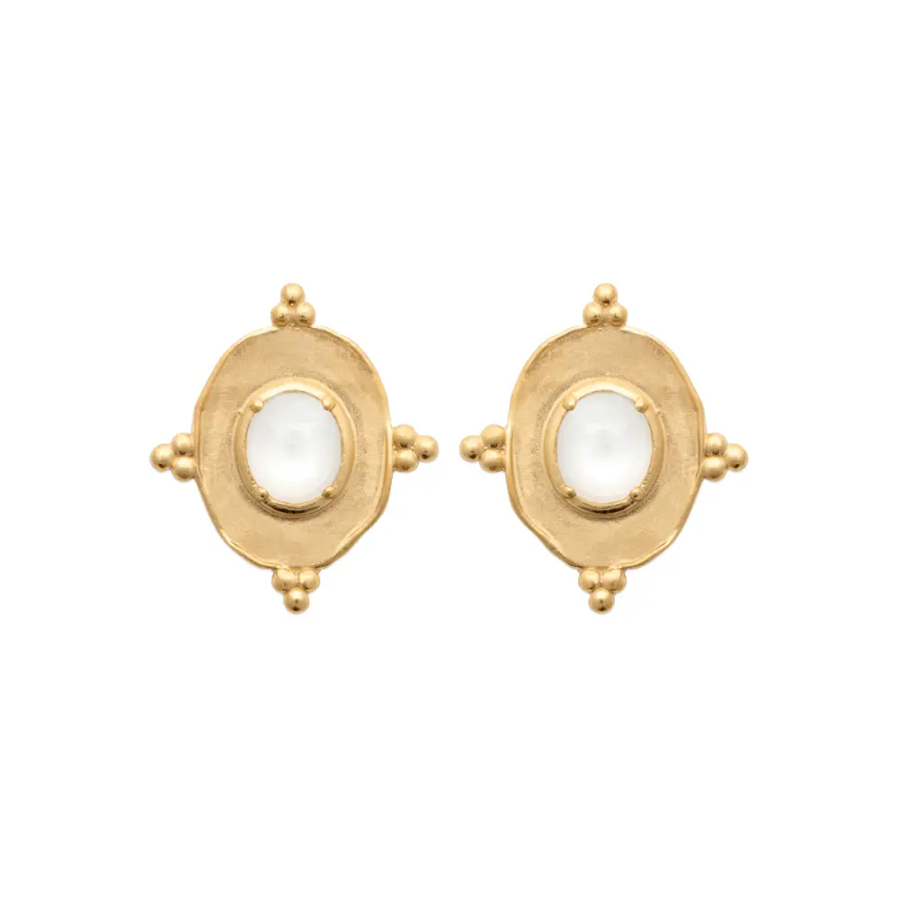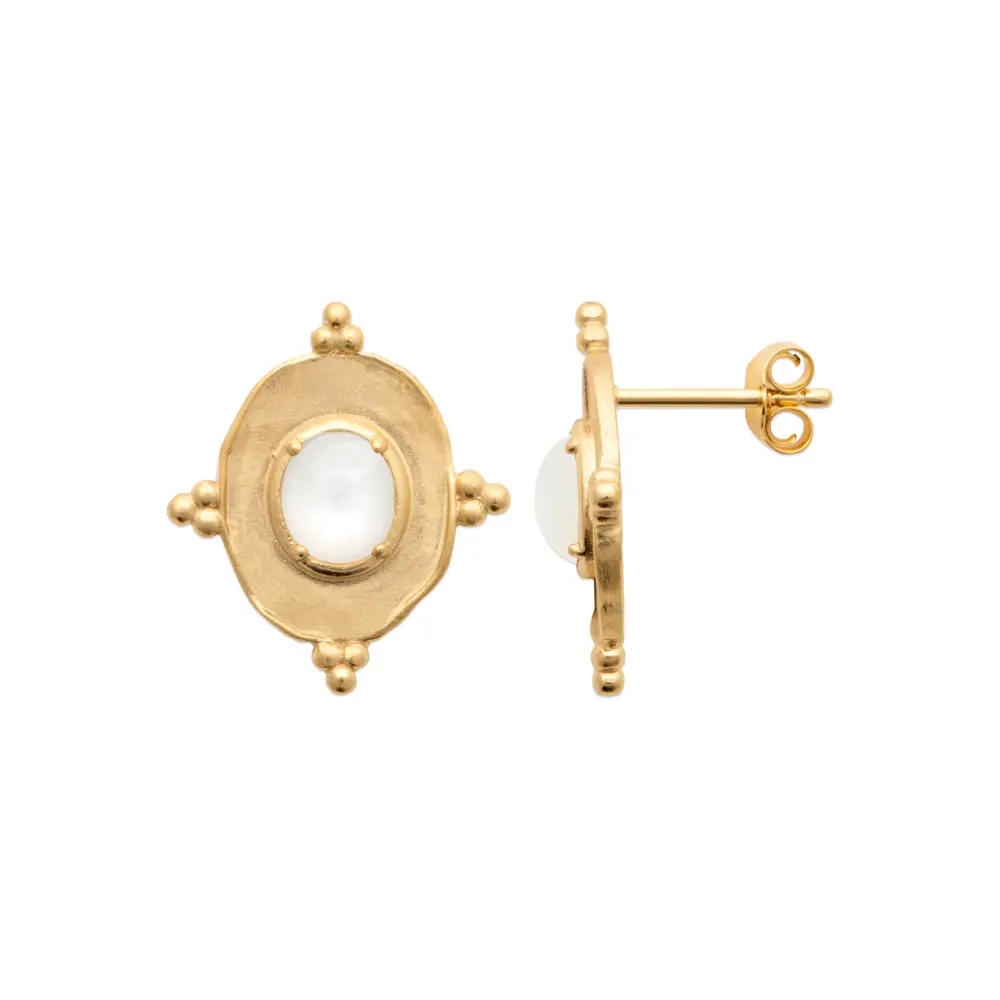 Ces clous d’oreilles avec pierre de lune s’inspirent de l’Ć¢ge d’or de la joaillerie, remettant au goĆ»t du jour le charme intemporel du style vintage. La monture en plaquĆ© or est travaillĆ©e avec une finition qui rappelle les techniques artisanales d’autrefois, donnant Ć chaque piĆØce un aspect unique et une prĆ©sence remarquable. La pierre de lune, centrĆ©e et mise en valeur par un ovale dorĆ©, est entourĆ©e de petites sphĆØres qui ajoutent un aspect ludique et riche en dĆ©tails. La pierre elle-mĆŖme Ć©met une lueur douce, presque sereine, qui se marie harmonieusement avec la chaleur de l’or. Ces clous d’oreilles offrent une alternative parfaite Ć la femme moderne qui se dĆ©lecte de la fusion entre tradition et tendance actuelle.