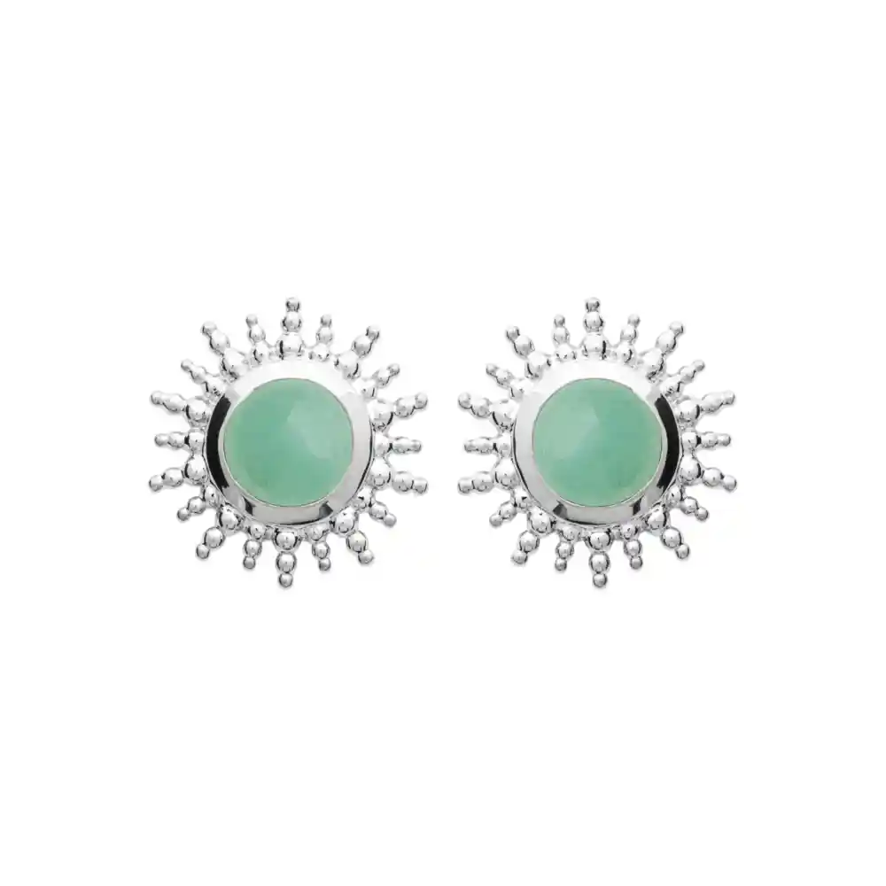 Éclat et harmonie : Clous d’oreilles soleil aventurine en argent rhodié