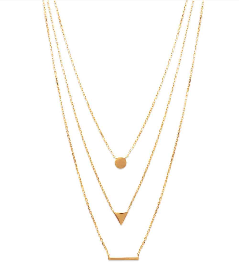 Portez ce collier à trois rangs avec des pendentifs géométriques en plaqué or et laissez les formes simples mais puissantes parler de votre goût raffiné et de votre amour pour la beauté minimaliste.