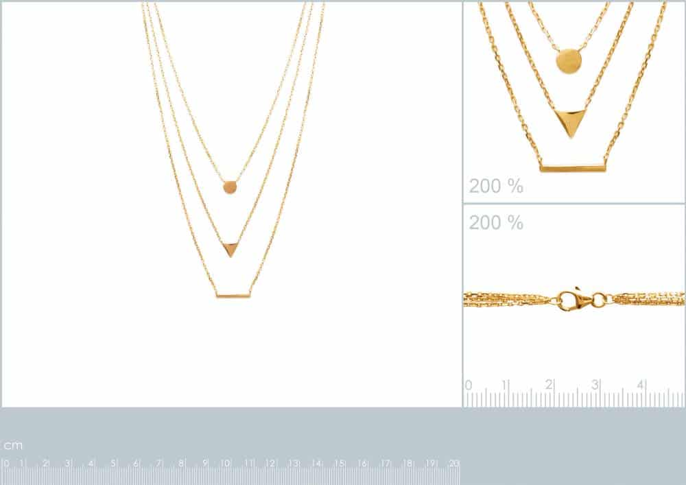 Ce collier à trois rangs avec pendentifs géométriques marie avec finesse l’intemporalité des formes simples à l’éclat chaleureux du plaqué or. Avec un rond, un triangle, et une barrette horizontale, ce bijou offre une symphonie de formes qui captent la lumière et le regard, le rendant idéal pour celles qui chérissent la simplicité ornée.