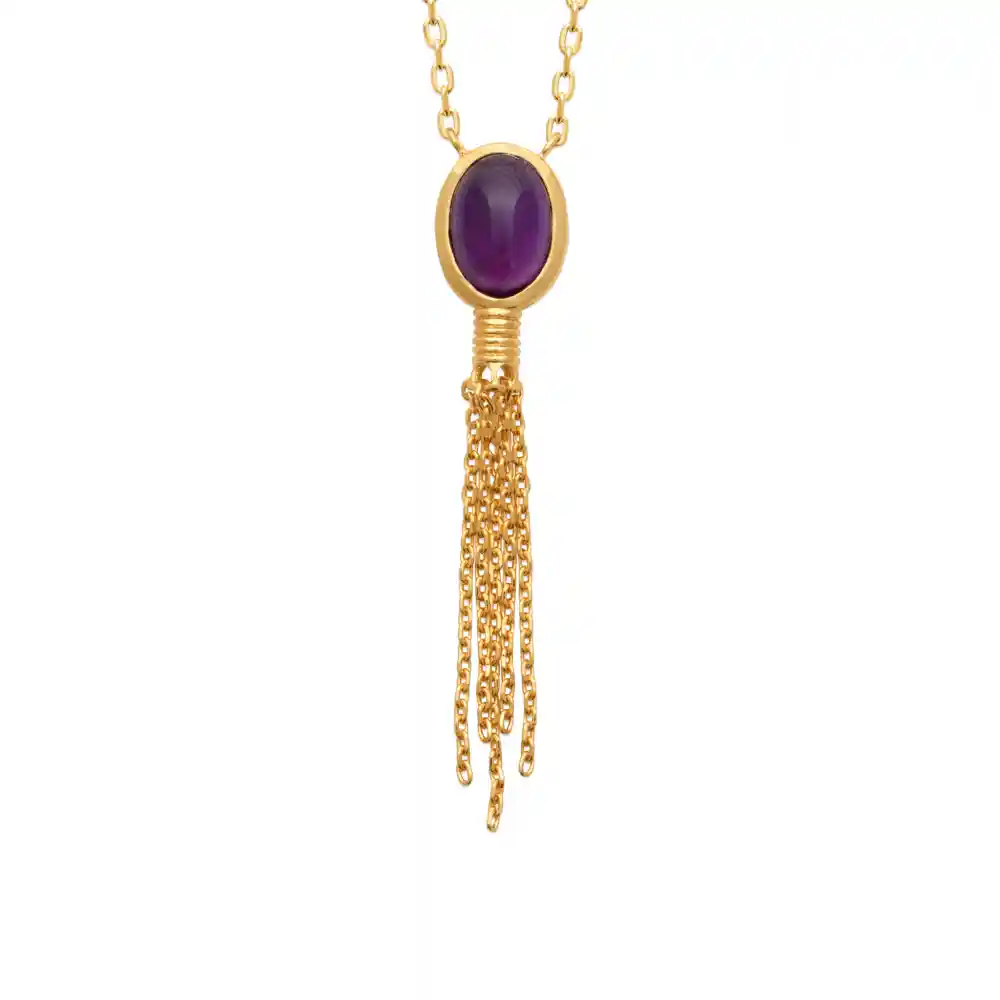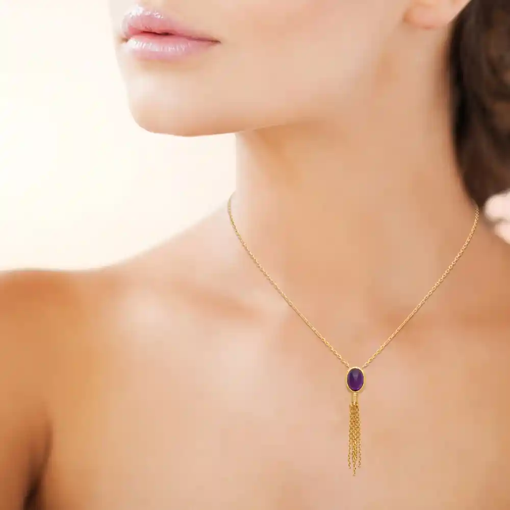 Ce collier délicat présente une pierre d’améthyste ovale sertie, suspendue à une chaîne plaquée or. La pierre est d’une couleur violet profond, capturant la lumière pour révéler des nuances allant du lilas au pourpre foncé. L’élément central est surmonté d’une bélière également plaquée or, d’où tombent plusieurs chaînettes fines formant une cascade élégante et dynamique. Cette touche de mouvement confère au bijou un caractère à la fois chic et audacieux.