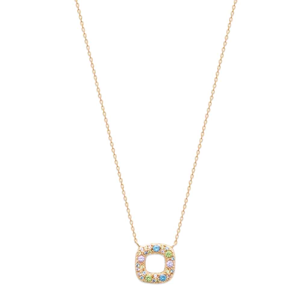 Ce collier se distingue par son pendentif carrĆ© aux coins arrondis, incrustĆ© de multiples pierres colorĆ©es formant un dĆ©licat arc-en-ciel. Les pierres scintillent dans une myriade de teintes, allant du rose tendre au bleu azur, en passant par des nuances ensoleillĆ©es d’orange et de jaune, offrant un spectacle visuel joyeux et vibrant. Suspendu Ć une chaĆ®ne en plaquĆ© or fine et dĆ©licate, le pendentif joue avec la lumiĆØre Ć chaque mouvement, attirant l’Åil avec son Ć©clat colorĆ©.