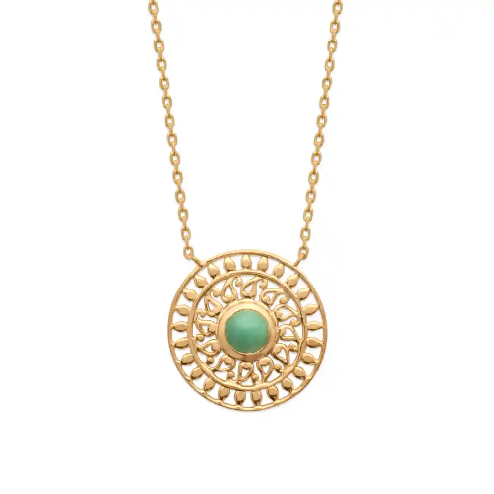 Ce collier en plaquĆ© or se distingue par son pendentif dĆ©licatement ajourĆ©, formant des arabesques autour d’une sĆ©duisante pierre d’aventurine. Le jeu de transparence et de matiĆØre crĆ©e une danse visuelle entre la lumiĆØre et l’ombre, faisant de ce bijou un vĆ©ritable objet d’art Ć porter. La pierre, d’un vert doux et apaisant, est encerclĆ©e par l’or comme pour en souligner la prĆ©ciositĆ© naturelle. MatiĆØre et esthĆ©tique: L’utilisation du plaquĆ© or pour la chaĆ®ne et le pendentif ajourĆ© allie rĆ©sistance et brillance, tout en offrant une touche d’Ć©clat solaire. L’aventurine, soigneusement choisie pour sa teinte sereine, apporte une touche de couleur et de calme, offrant un contraste saisissant avec la chaleur de l’or.
