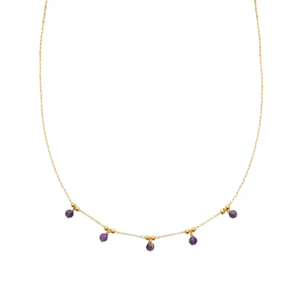 Ce collier en plaqué or se distingue par sa finesse et son allure aérienne. Il présente une chaîne délicate en maille forçat, ponctuée de cinq améthystes naturelles aux teintes violet profond, espacées de façon harmonieuse. Ces pierres, taillées en forme de goutte et montées en breloque, ajoutent une touche de couleur et d’éclat subtil sans surcharger le design. Chaque améthyste est rehaussée par de petites perles dorées qui soulignent leur éclat. Le collier mesure environ 42 cm de longueur, ce qui le positionne élégamment sur le décolleté.