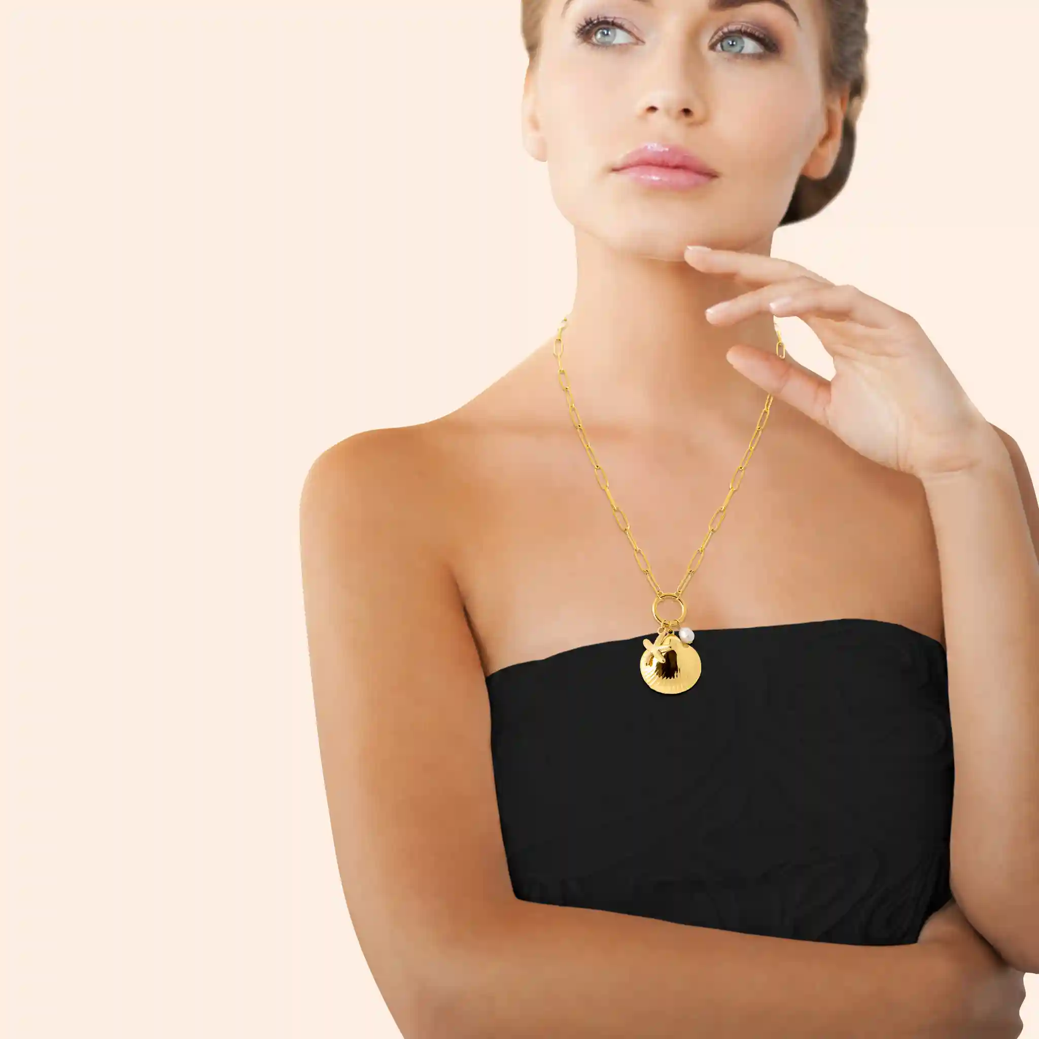 Un souffle marin se glisse autour du cou, comme un souvenir d’été capturé dans la lumière dorée. Ce collier évoque l’évasion et la douceur des rivages, avec une présence délicate qui suggère la mer sans jamais l’imiter. Les motifs s’articulent avec harmonie autour d’une étoile de mer et d’un coquillage, accompagnés d’une perle qui apporte une note douce et lumineuse. L’ensemble compose un équilibre subtil entre formes organiques et lignes fines, dans une esthétique inspirée de la nature. Réalisé en acier inoxydable doré, ce collier présente une finition soignée et stable. La matière conserve son éclat au fil du temps.…