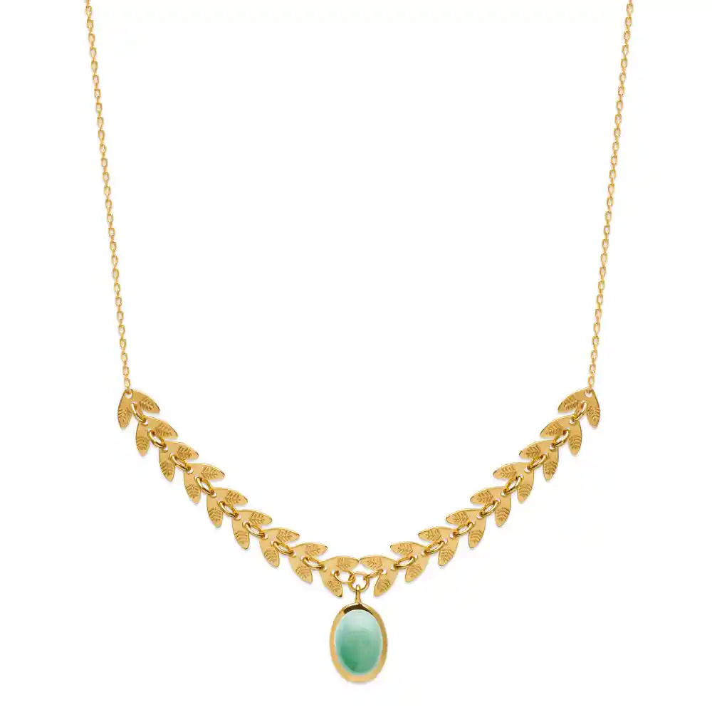 Le collier laurier que nous contemplons est un hymne Ć la nature et Ć l’Ć©lĆ©gance. Il met en scĆØne une chaĆ®ne en plaquĆ© or Ć laquelle est suspendu un pendentif ovale d’aventurine, comme une feuille portĆ©e par le vent. Le design s’inspire de la forme des feuilles de laurier, connues pour ĆŖtre un symbole de triomphe et de noblesse, qui dĆ©corent dĆ©licatement la chaĆ®ne et encadrent la pierre avec grĆ¢ce et lĆ©gĆØretĆ©. MatiĆØre et symbolique: La chaĆ®ne et les feuilles de laurier en plaquĆ© or offrent une brillance chaude et une finition dĆ©taillĆ©e qui capturent la lumiĆØre Ć chaque mouvement. La pierre d’aventurine, d’un vert tendre, rappelle la sĆ©rĆ©nitĆ© des forĆŖts anciennes et ajoute une touche de couleur et de zenitude Ć l’ensemble.