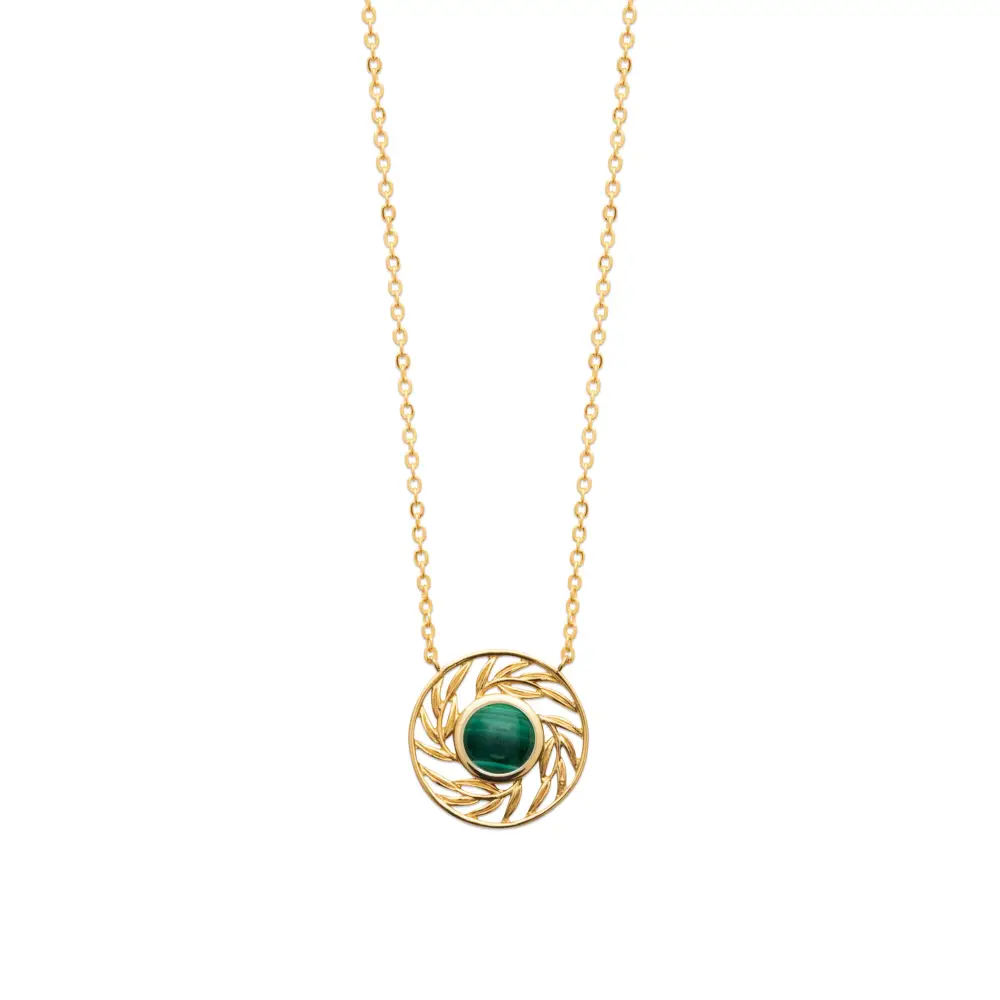 Ce bijou avec malachite est un hommage Ć l’art et Ć la nature, avec un pendentif en plaquĆ© or qui dessine dĆ©licatement une couronne de laurier. Les feuilles finement ouvragĆ©es forment un nid d’où Ć©merge la malachite, sĆ©lectionnĆ©e pour sa teinte verte Ć©clatante et ses veines charismatiques. Le design ouvert et aĆ©rĆ© du pendentif offre un contraste saisissant avec le caractĆØre plein et mystĆ©rieux de la pierre.