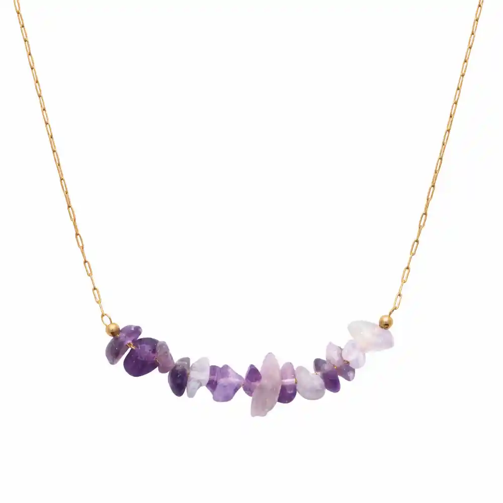 Ce collier délicat se compose d’une chaîne en plaqué or subtilement travaillée, soulignant une suite de pierres d’améthyste violet. Les gemmes, soigneusement taillées en formes irrégulières et polies, dévoilent un camaïeu de violet, allant de teintes pâles à des nuances plus profondes et riches, capturant ainsi la lumière et l’attention. Les pierres sont disposées en une élégante progression, créant un effet de douceur et de dynamisme autour de votre cou.