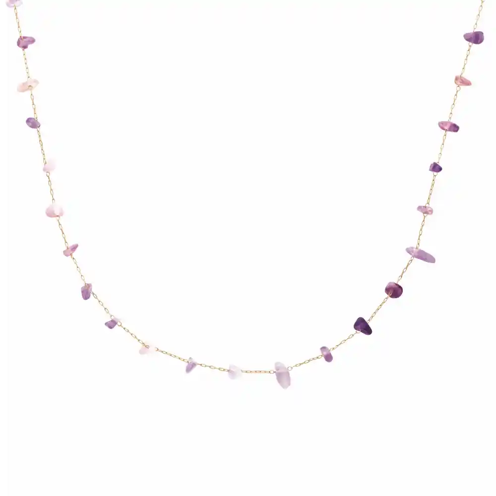 Ce collier en plaqué or présente une délicate succession de pierres naturelles d’améthyste, connues pour leur couleur violet intense, et variantes de rose pâle. Chaque pierre est unique, taillée de manière irrégulière, ce qui confère à ce bijou une personnalité singulière et un charme authentique. Entre chaque pierre précieuse, une fine chaîne en plaqué or scintille, ajoutant une touche de lumière à la composition. Le collier mesure 45 cm et dispose d’une chaîne de réglage de 3 cm pour s’adapter parfaitement à chaque silhouette.