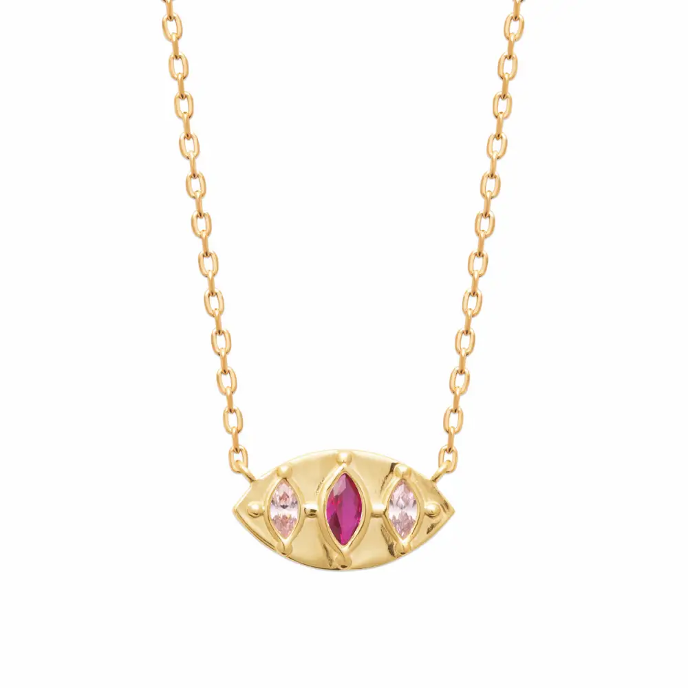Ce collier en plaqué or présente un pendentif aux formes géométriques, où les losanges se rencontrent dans une harmonie de couleurs. Au centre, un rubis synthétique, flamboyant et vibrant, est flanqué de deux quartz roses synthétiques, évoquant une palette de douceur et de force. L’éclat du rubis apporte une touche de passion, tandis que le quartz rose diffuse une aura d’affection et de calme, le tout mis en valeur par le cadre doré.