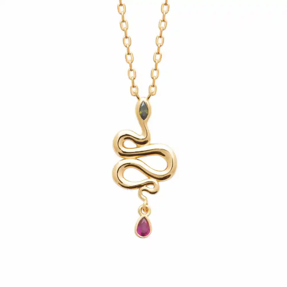 La silhouette sinueuse du serpent est rendue avec fluidité, et les gemmes synthétiques sont posées avec intention, évoquant les yeux hypnotiques et la dangereuse beauté de cet animal. La chaîne en plaqué or est choisie pour sa délicatesse, mettant en valeur le pendentif sans le surcharger.