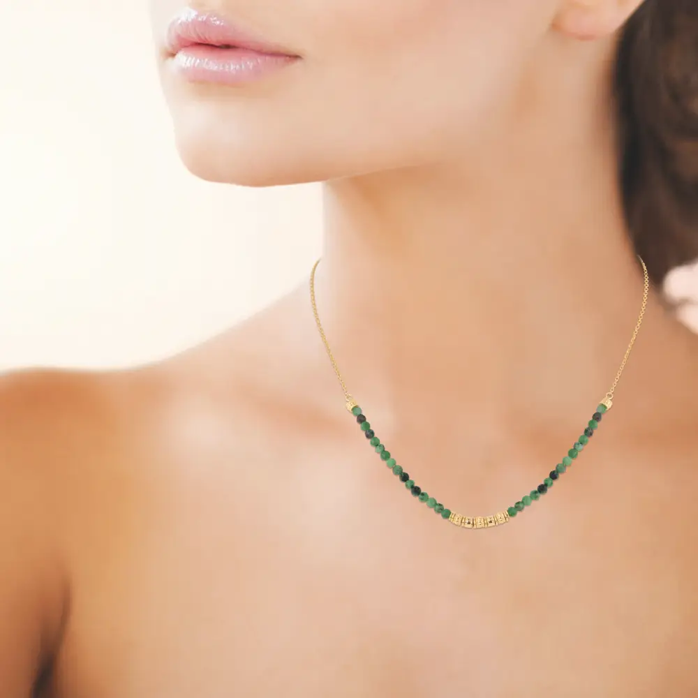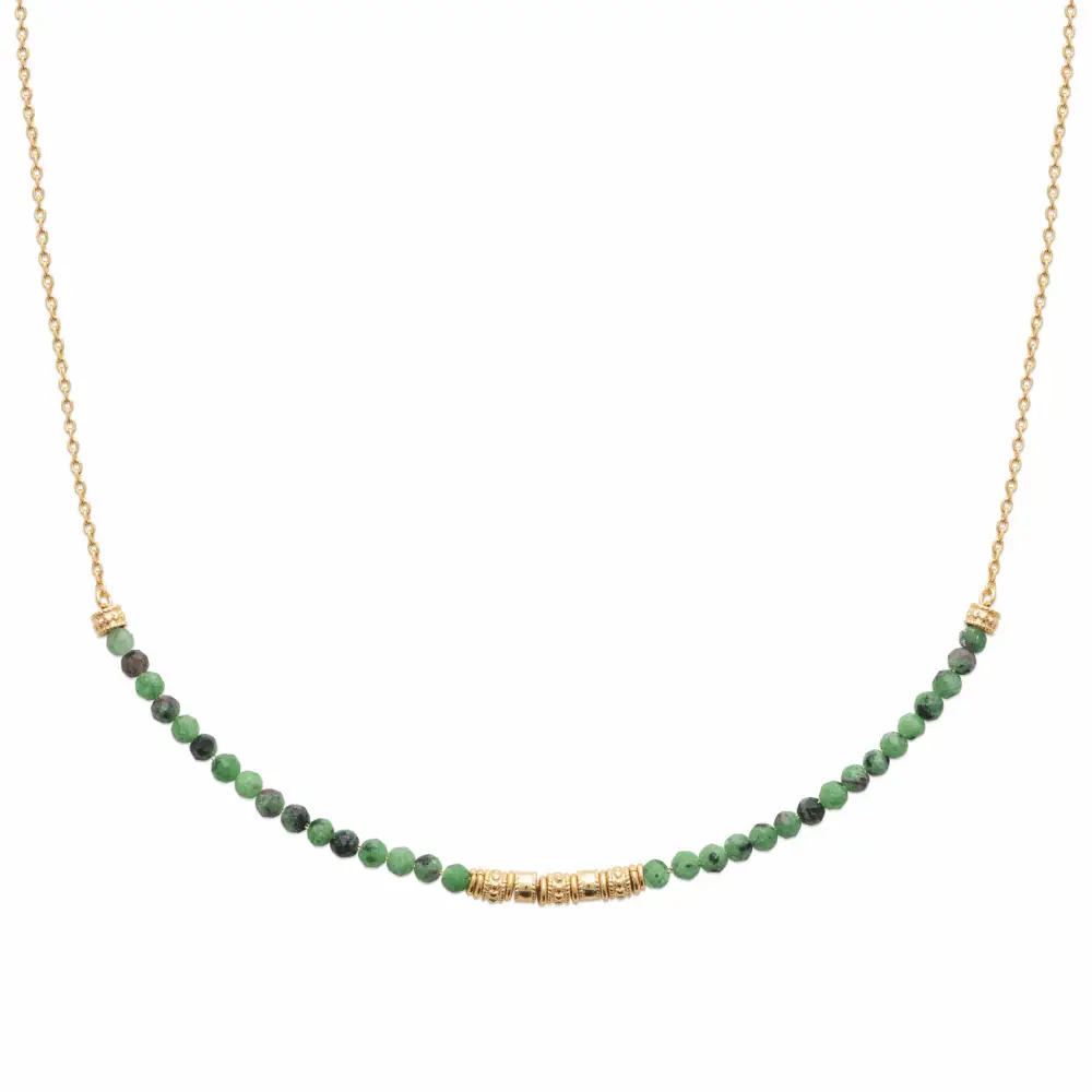 Ce collier se distingue par son enfilade de perles de rubis zoïsite, alternant des teintes de vert profond et de noir marbré, intercalées avec de larges anneaux en plaqué or. La variation naturelle de couleur dans chaque perle confère à ce bijou une unicité et un charme rustique. Les anneaux plaqués or ajoutent un contraste lumineux et une touche d’opulence à l’ensemble.