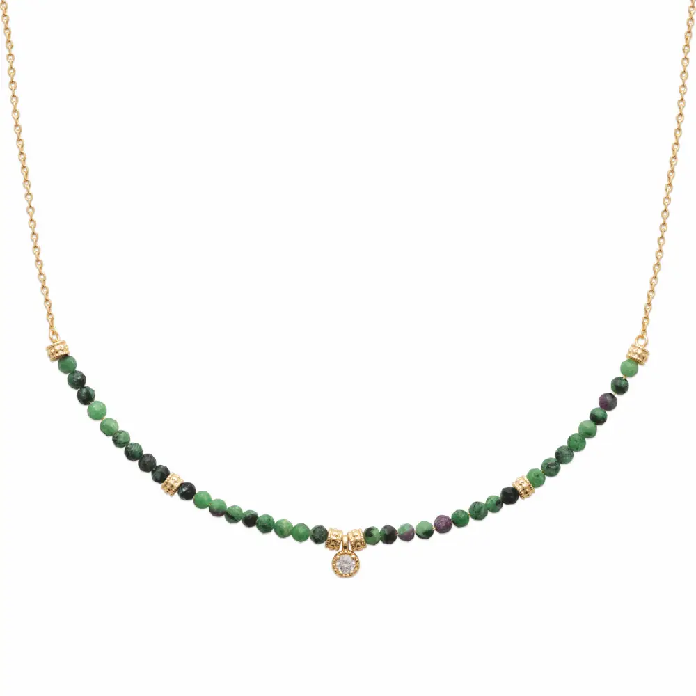 Ce collier en plaqué or se pare de perles de rubis zoïsite, alternant avec une symétrie délicate, et s’orne d’une breloque ronde en diamant synthétique qui pend gracieusement au centre. Le vert émeraude des perles, rehaussé par des éclats pourpres, contraste avec le scintillement du diamant synthétique, créant une pièce de bijouterie qui embrasse à la fois la robustesse de la terre et la brillance du ciel.