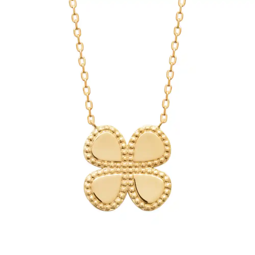 Ce délicat collier plaqué or captive l’attention avec son pendentif en forme de trèfle, chaque feuille capturant la lumière pour révéler la pureté et la brillance du plaqué or. La conception est rehaussée par un effet de texture donné par une succession de petites sphères dorées, apportant une touche de sophistication à l’ensemble. Cette approche délicate crée un jeu de lumière subtil qui souligne la forme emblématique du trèfle, connue pour symboliser la chance et l’harmonie.